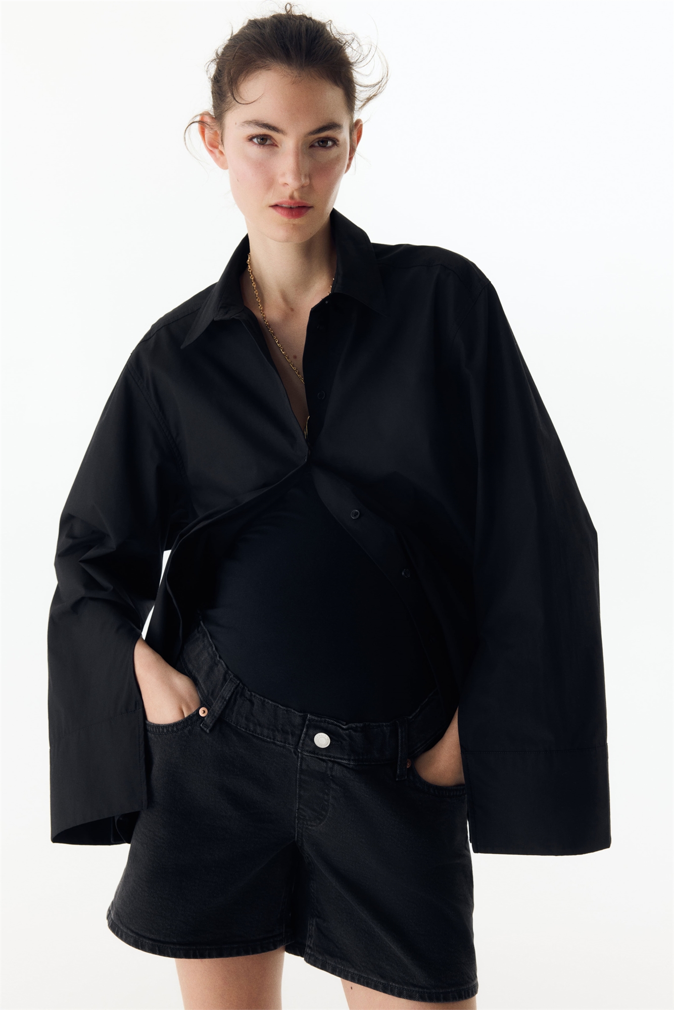 Шорты с 5 карманами из хлопкового денима с эластичной отделкой по бокам и широкой панелью из джерси на талии для лучшей посадки на животе.