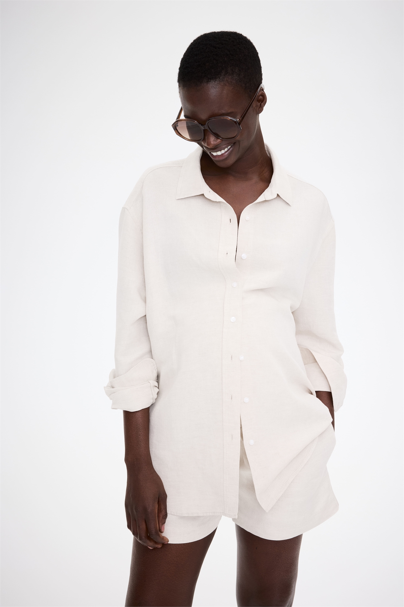 Свободные шорты из воздушного льняного и вискозного полотна с эластичной отделкой и широкой панелью из джерси на талии для лучшей посадки на животе. Незаметные боковые карманы.