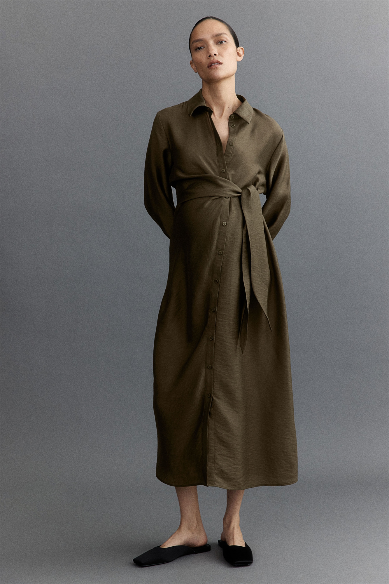 Платье-рубашка длиной до колен из тканого материала с воротником, пуговицами спереди и завязкой под бюстом. Длинные рукава с манжетами на пуговицах. Платье можно носить как во время, так и после беременности.