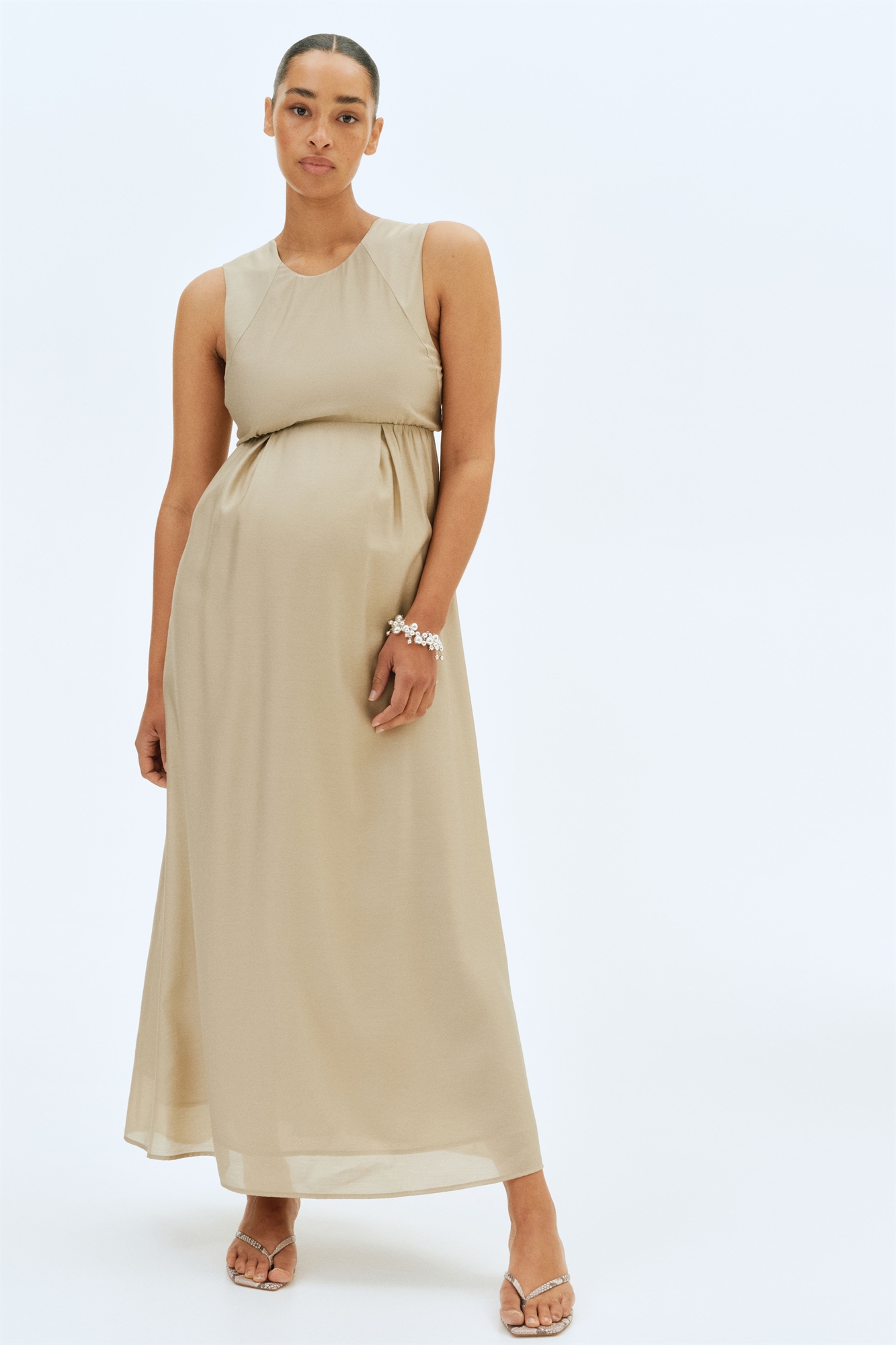 Платье длиной до щиколоток, без рукавов, из тканого материала, с круглым вырезом и открытой спиной с широкими бретелями и большим бантом. Узкая эластичная резинка под бюстом и расклешенная юбка с перевернутыми коробчатыми складками для придания объема. На подкладке.