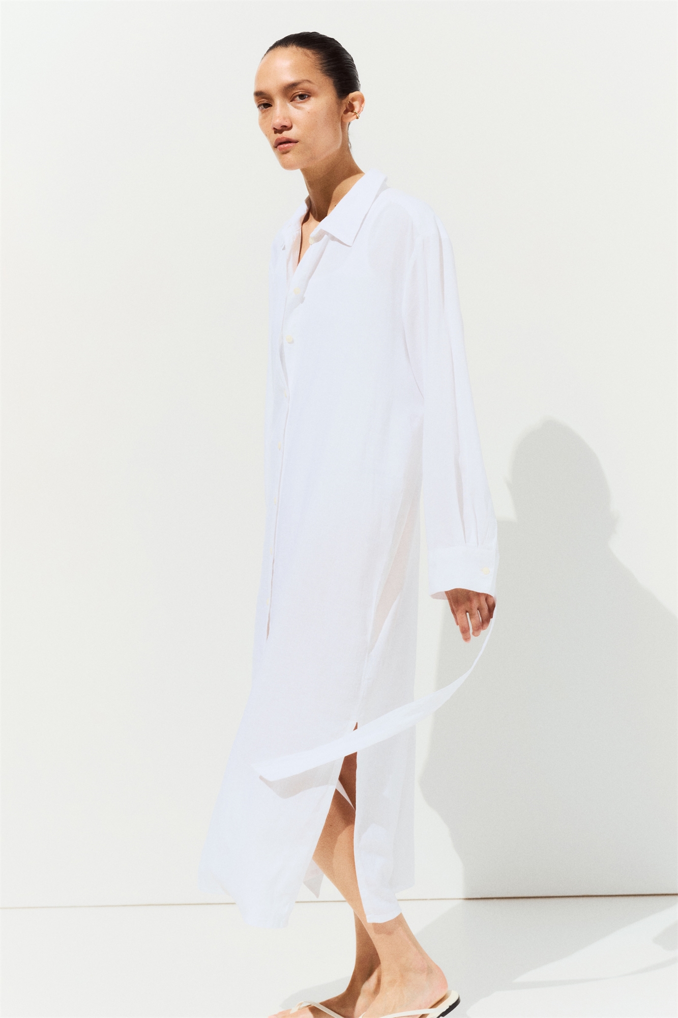 Платье-рубашка длиной до колен из воздушной ткани из льна и вискозы с воротником и пуговицами спереди. Свободный крой с двухслойным вырезом сзади и длинными рукавами с втачным рукавом и манжетами на пуговицах. Съемный пояс-завязка под бюстом и подол прямого кроя с разрезом с каждой стороны. Без подкладки.