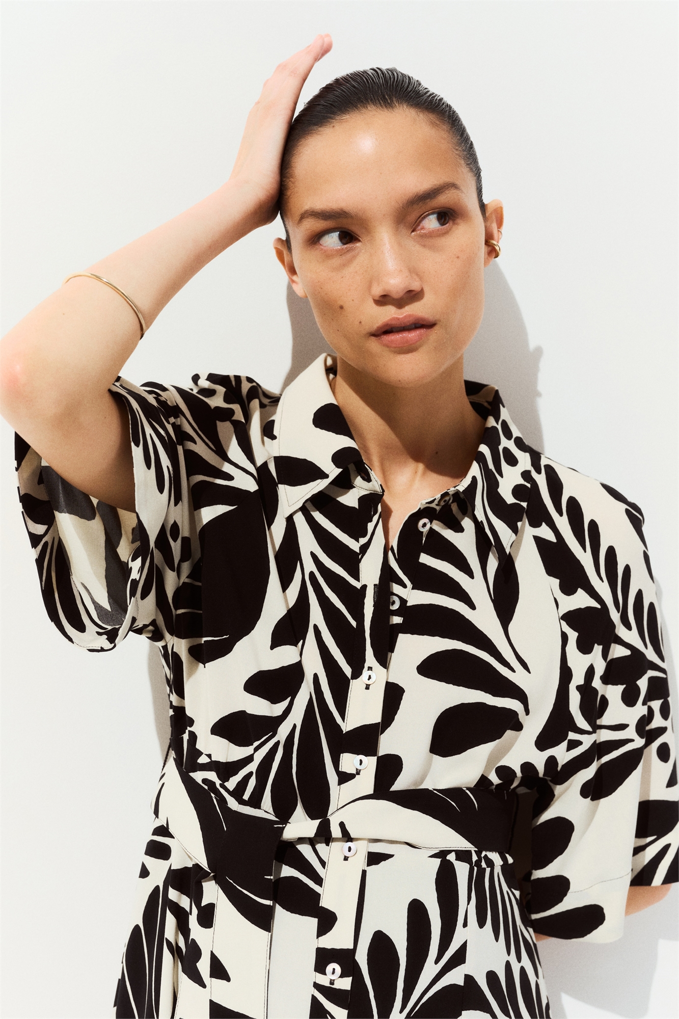Платье длиной до колен из вискозы с отложным воротником, пуговицами спереди и рукавами реглан длиной до локтя. Эластичная резинка на талии сзади и широкий съемный пояс-завязка. Платье можно носить как во время, так и после беременности. Без подкладки.