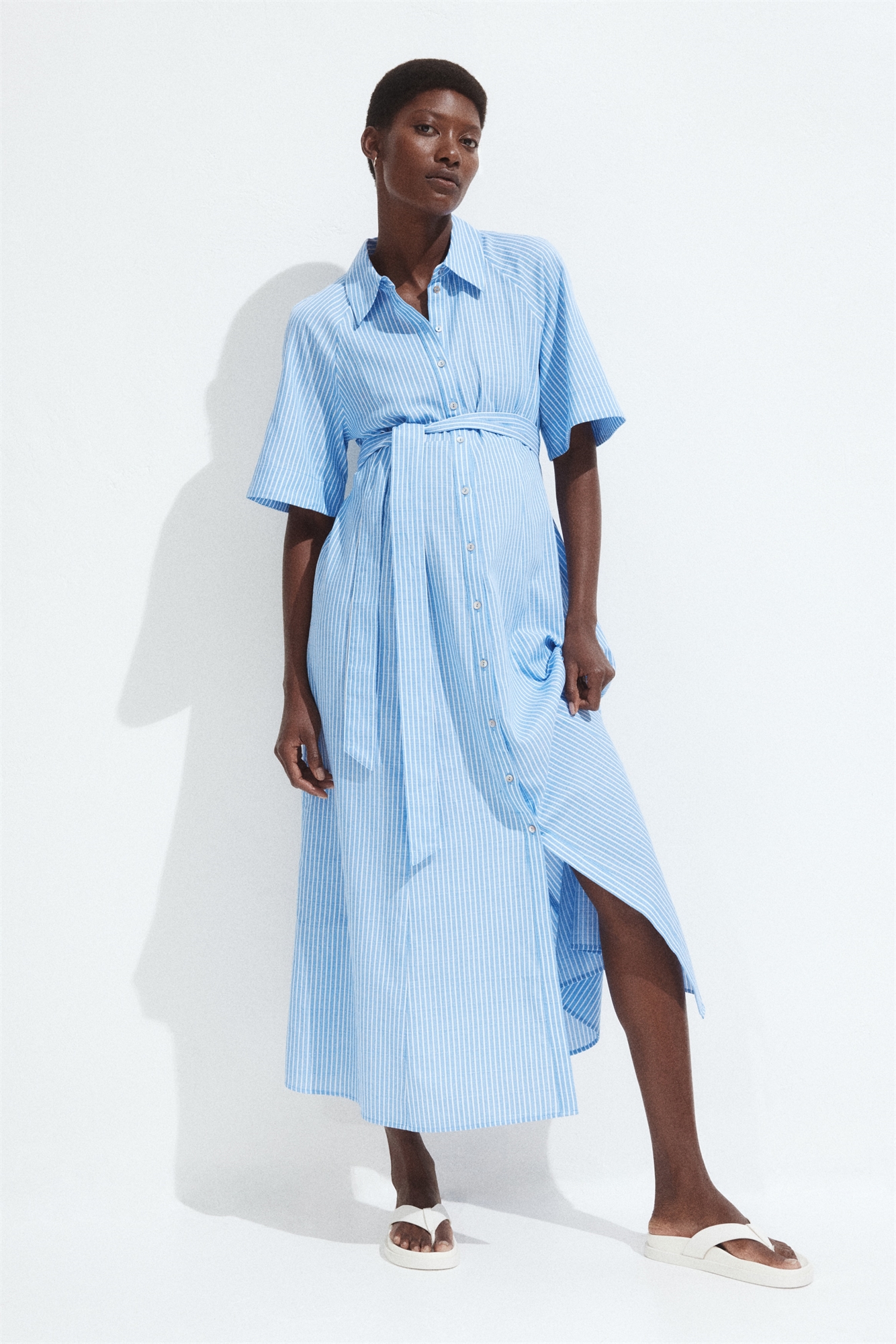 Платье длиной до колен из вискозы с отложным воротником, пуговицами спереди и рукавами реглан длиной до локтя. Эластичная резинка на талии сзади и широкий съемный пояс-завязка. Платье можно носить как во время, так и после беременности. Без подкладки.