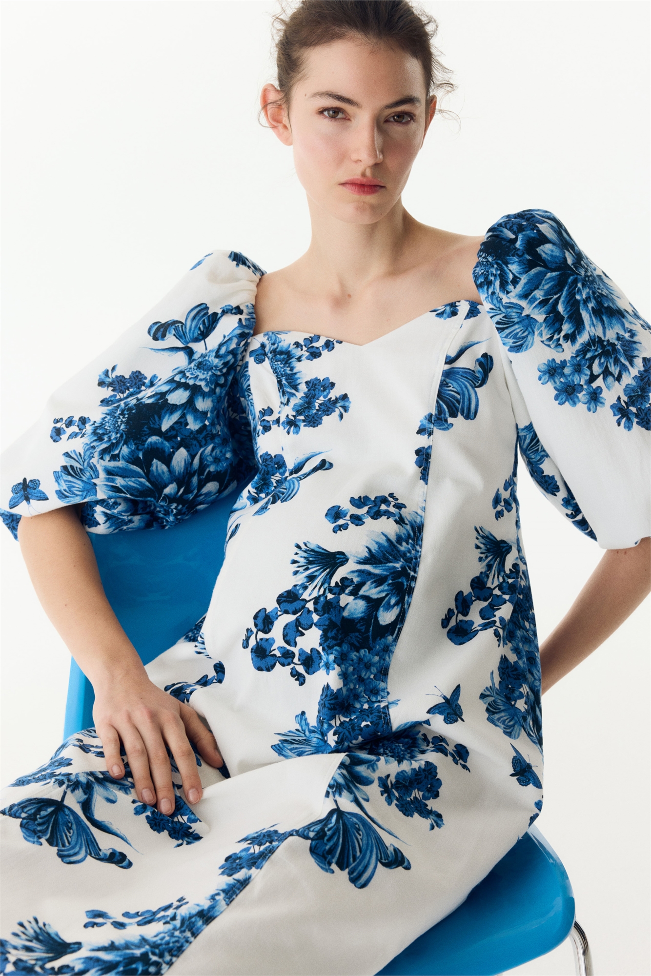 Приталенное платье длиной до колен из хлопкового крепа с формирующими швами спереди и сзади. Вырез-лодочка, широкая планка сзади и рукава-баллоны длиной до локтя с наполнителем из органзы для придания объема. Потайная застежка-молния с одной стороны и прямой подол с разрезом сзади. На подкладке.