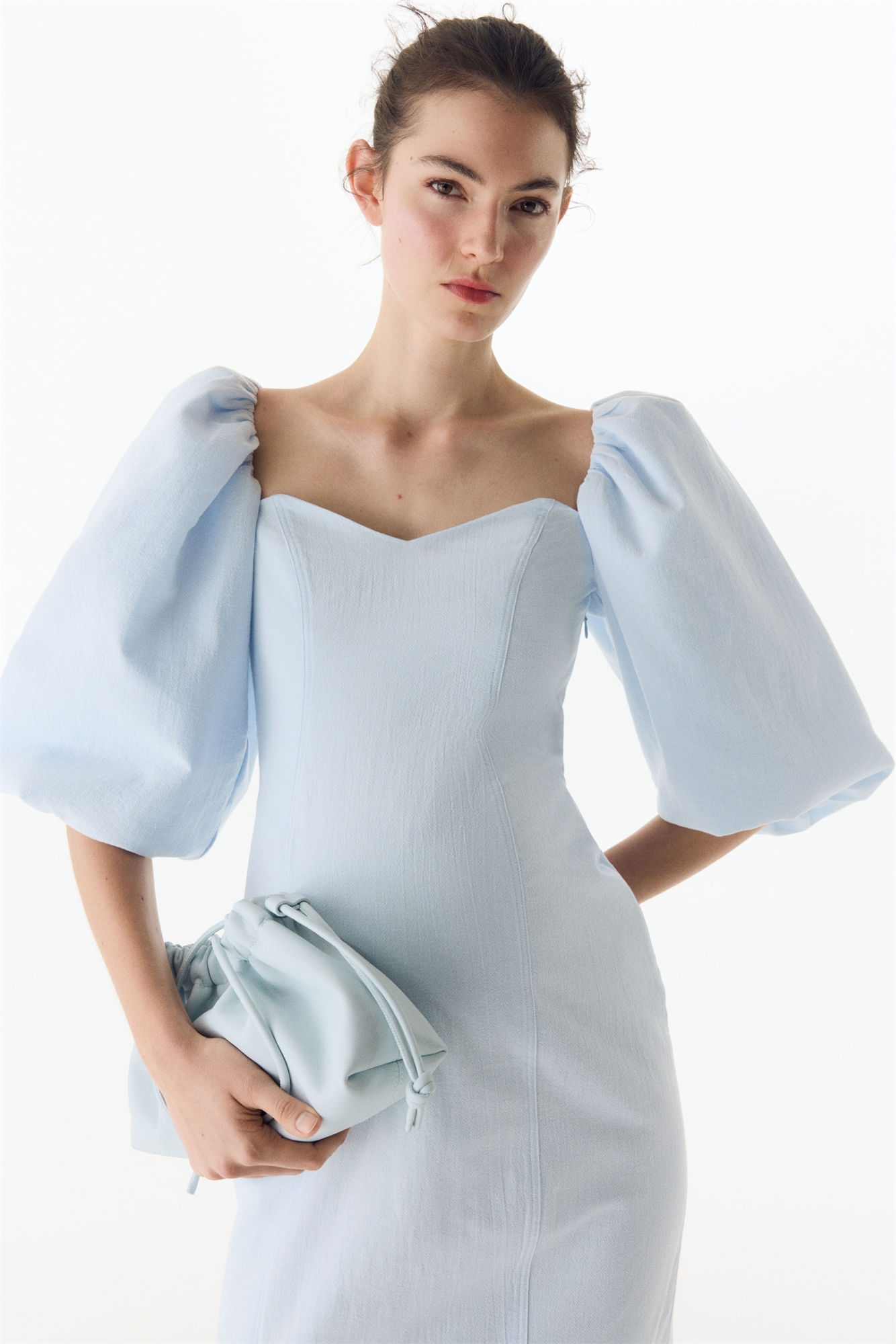 Приталенное платье длиной до колен из хлопкового крепа с формирующими швами спереди и сзади. Вырез-лодочка, широкая планка сзади и рукава-баллоны длиной до локтя с наполнителем из органзы для придания объема. Потайная застежка-молния с одной стороны и прямой подол с разрезом сзади. На подкладке.