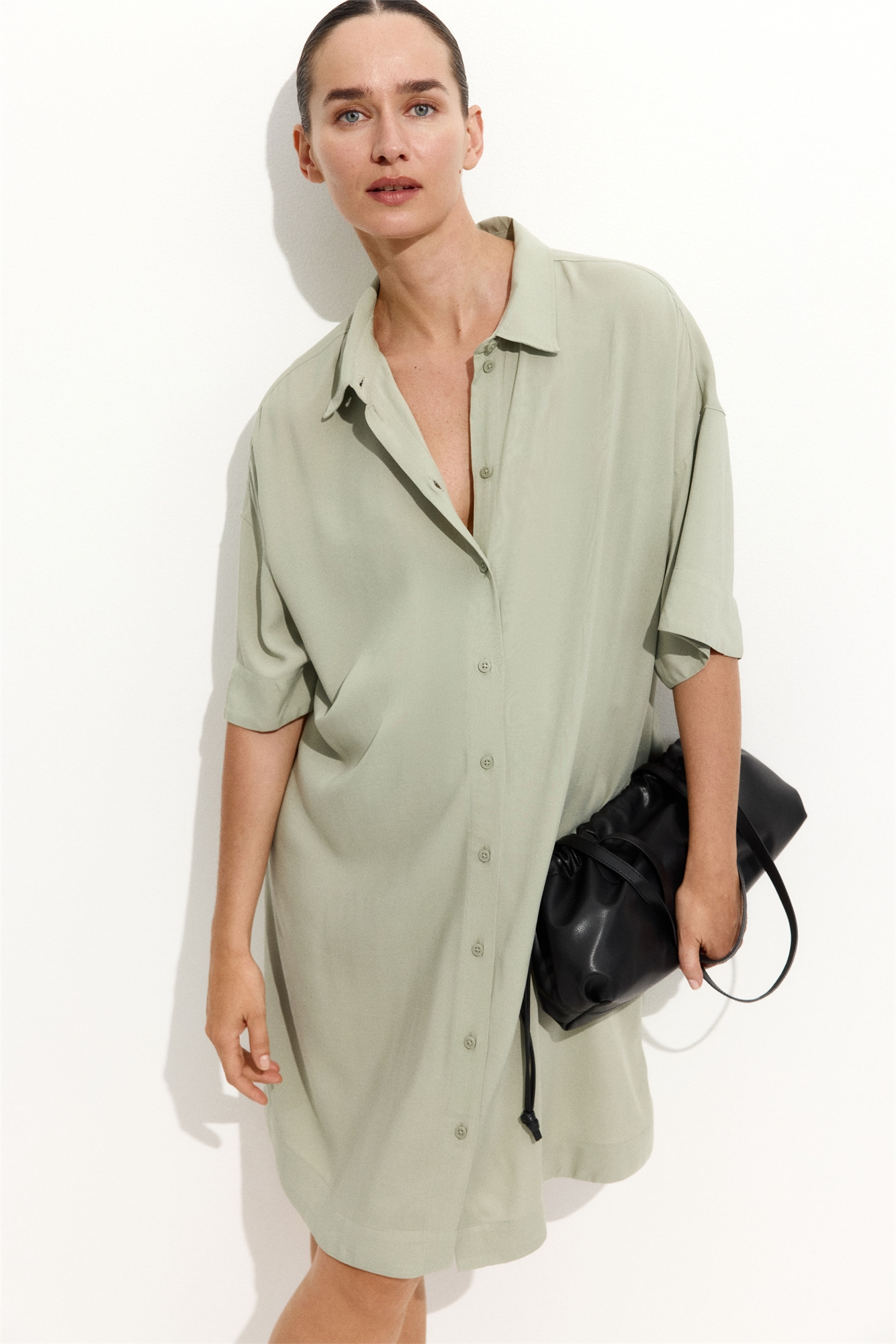 Короткое платье из вискозного полотна с воротником и пуговицами спереди. Свободный крой с опущенными плечами и короткими рукавами. Узкий съемный пояс-завязка под бюстом и подол прямого кроя. Платье можно носить как во время, так и после беременности.
