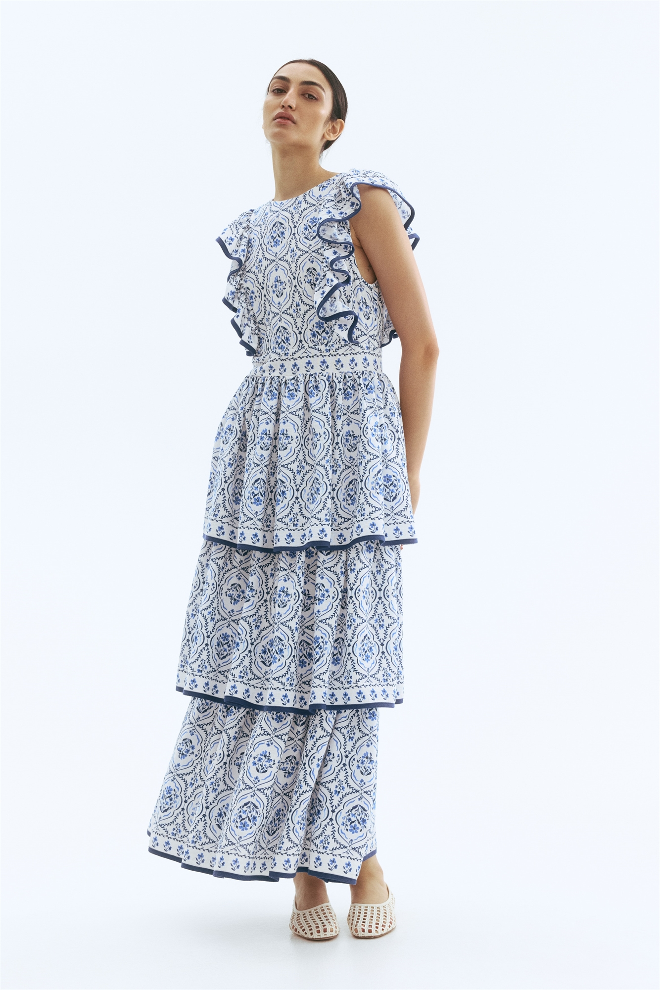 Платье для кормления длиной до щиколоток, без рукавов, из тканого материала, с круглым вырезом и открытой спиной. Плечи отделаны оборками, переходящими спереди на спину, спереди потайная молния для быстрого и удобного доступа к груди. Сзади потайная застежка-молния. Расклешенная юбка с широкими ярусами для придания объема. Без подкладки.