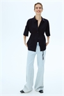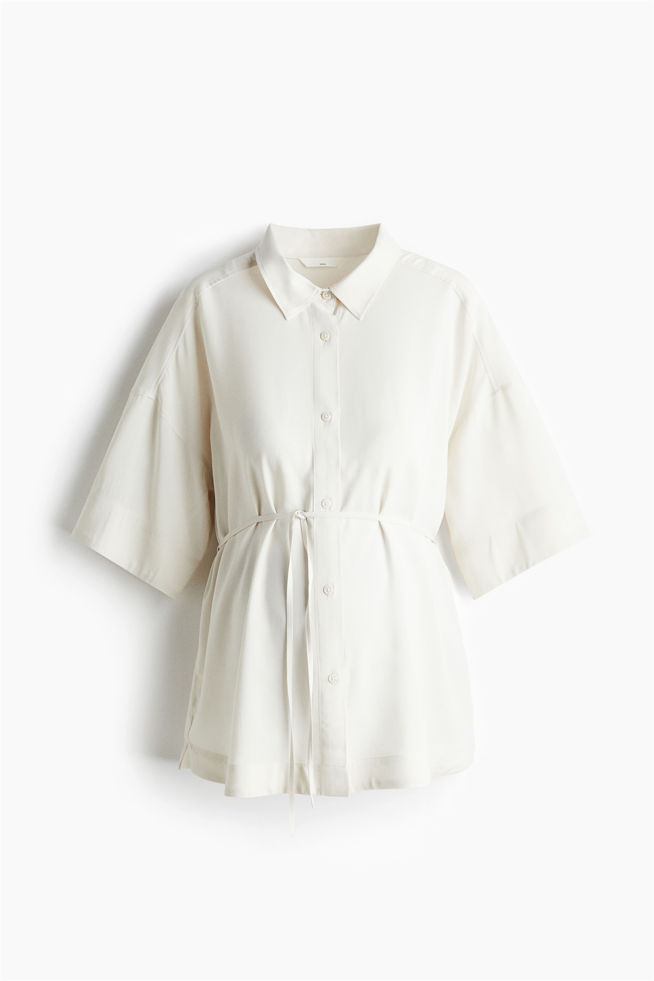 Рубашка из воздушного вискозного полотна с воротником и пуговицами спереди. Свободный крой с опущенными плечами, рукавами длиной до локтя и узким съемным поясом-завязкой на талии. Подол прямого кроя с разрезом с каждой стороны. Рубашку можно носить как во время, так и после беременности.