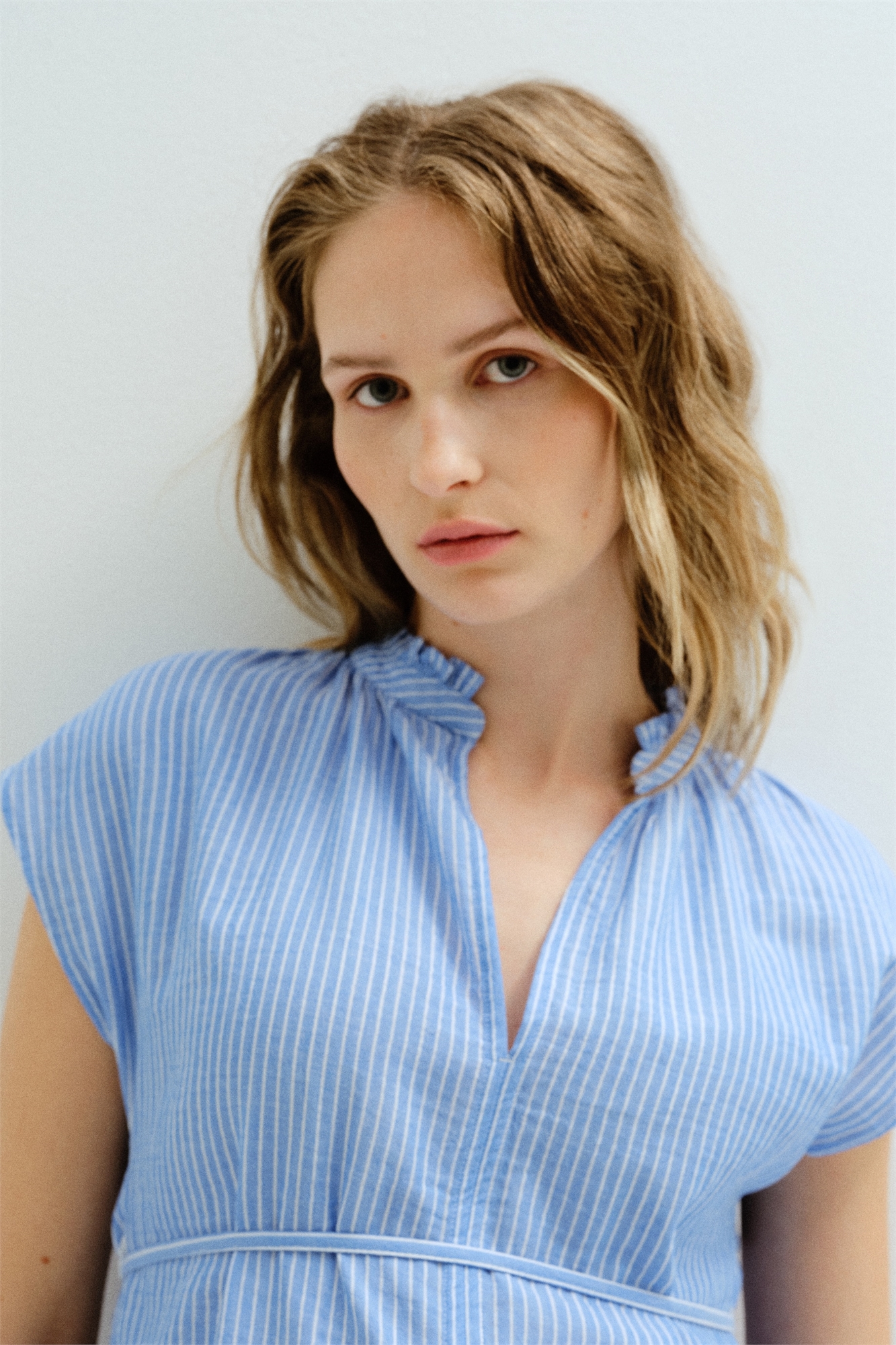 Блузка из мягкого хлопкового муслина с оборчатым воротником-бантом со сборками по всему периметру и V-образной проймой спереди. Рукава-капельки и съемный пояс с завязками-спагетти под бюстом. Изогнутый подол.