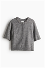 Короткий кардиган из мягкого трикотажа с круглым вырезом, украшенным стразами, пуговицами спереди и короткими рукавами. Окантовка вокруг выреза, на манжетах и подоле.