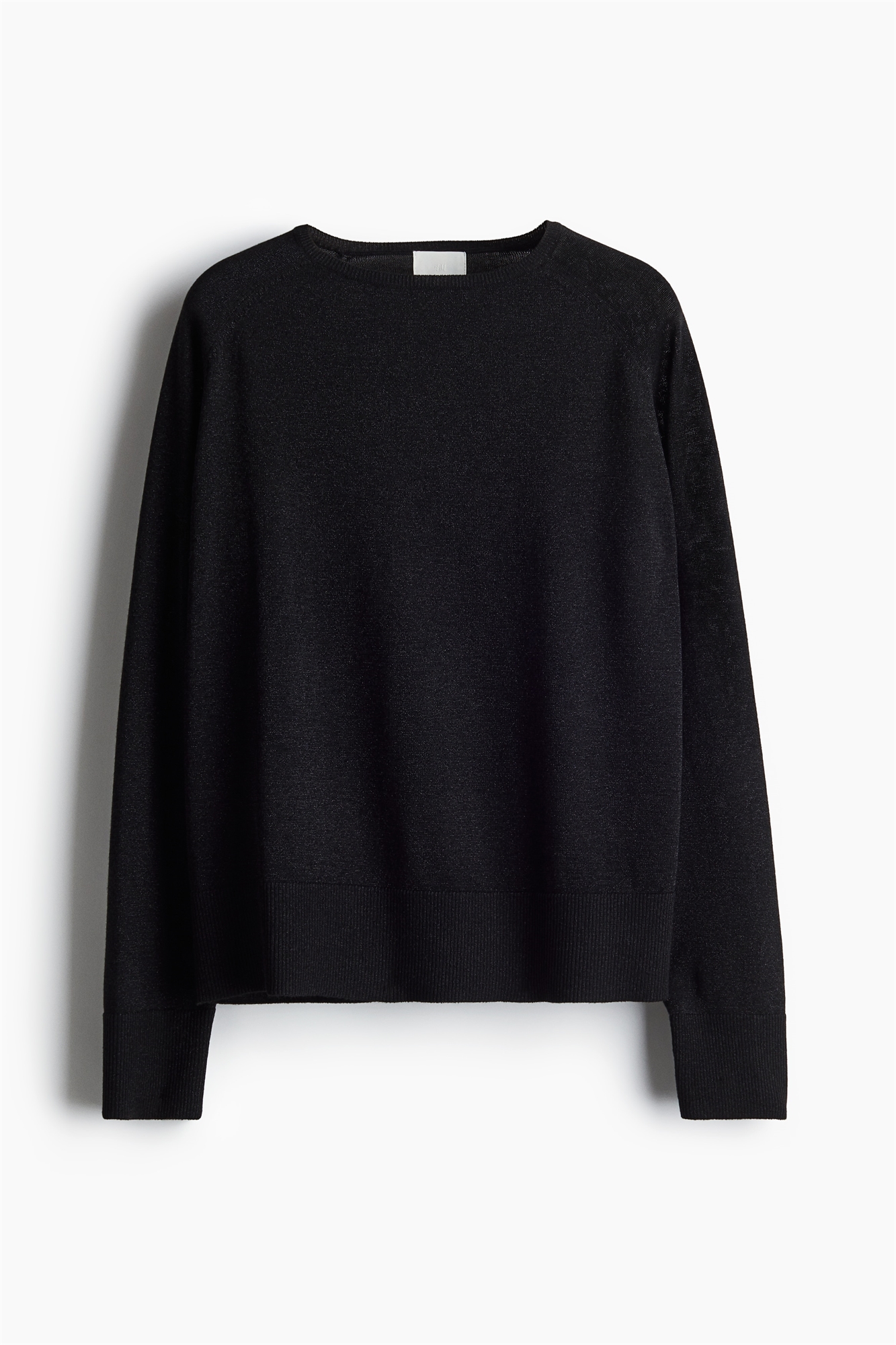 Джемпер свободного покроя из тонкого трикотажа с блестками. Круглый вырез с ребристой отделкой, длинные рукава с седлом и широкая ребристая отделка на манжетах и подоле.
