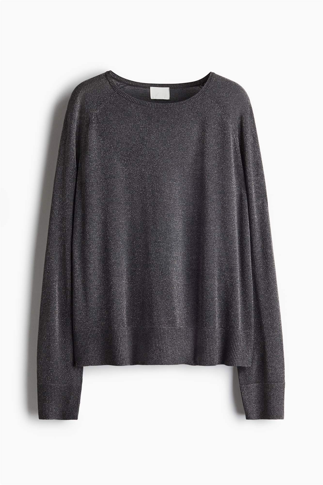 Джемпер свободного покроя из тонкого трикотажа с блестками. Круглый вырез с ребристой отделкой, длинные рукава с седлом и широкая ребристая отделка на манжетах и подоле.