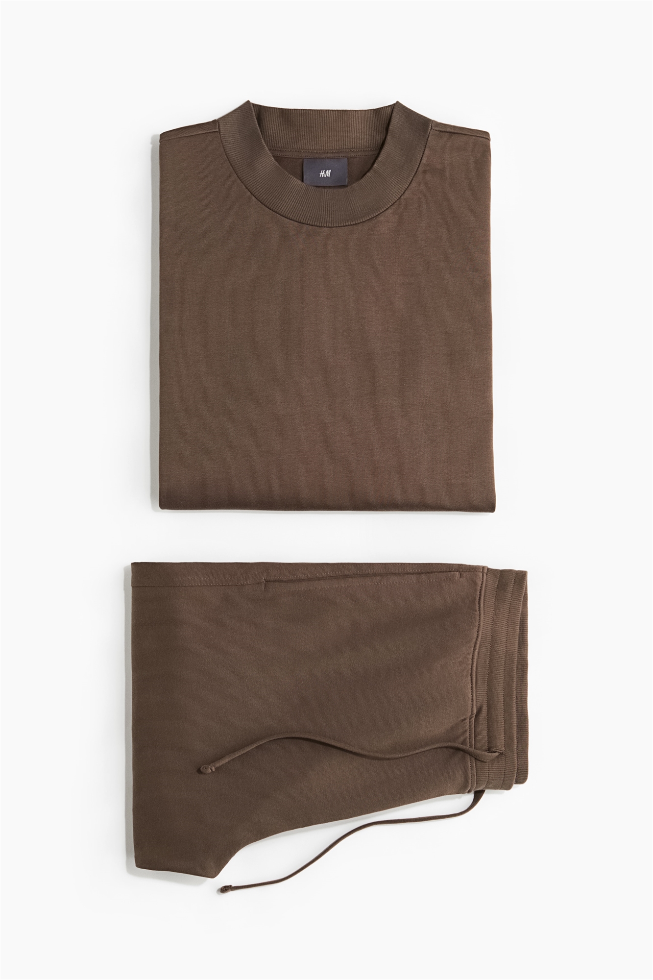 Пижама с длинными рукавами и брюками из хлопковой ткани средней плотности. Верхняя часть с небольшим ребристым воротником-стойкой, спущенными плечами и окантовкой на манжетах. Подол прямого кроя с небольшим разрезом с каждой стороны. Нижние брюки с эластичным материалом и утягивающим поясом на талии, фальшивой ширинкой и неброскими боковыми карманами.