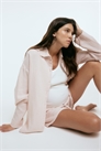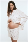 Пижама с рубашкой и шортами из мягкого хлопкового муслина. Рубашка с воротником, пуговицами спереди, накладным нагрудным карманом, спущенными плечами и длинными рукавами. Шорты с заниженной эластичной талией на завязках для удобной посадки во время и после беременности.