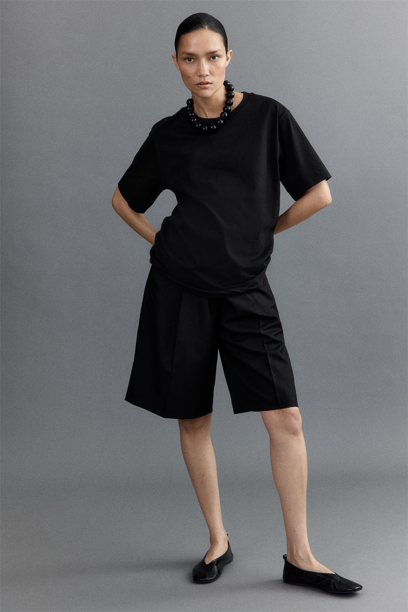 Футболка свободного кроя из мягкого хлопкового джерси с ребристой горловиной, спущенными плечами и рукавами, заканчивающимися чуть выше локтей.