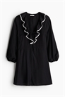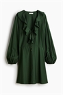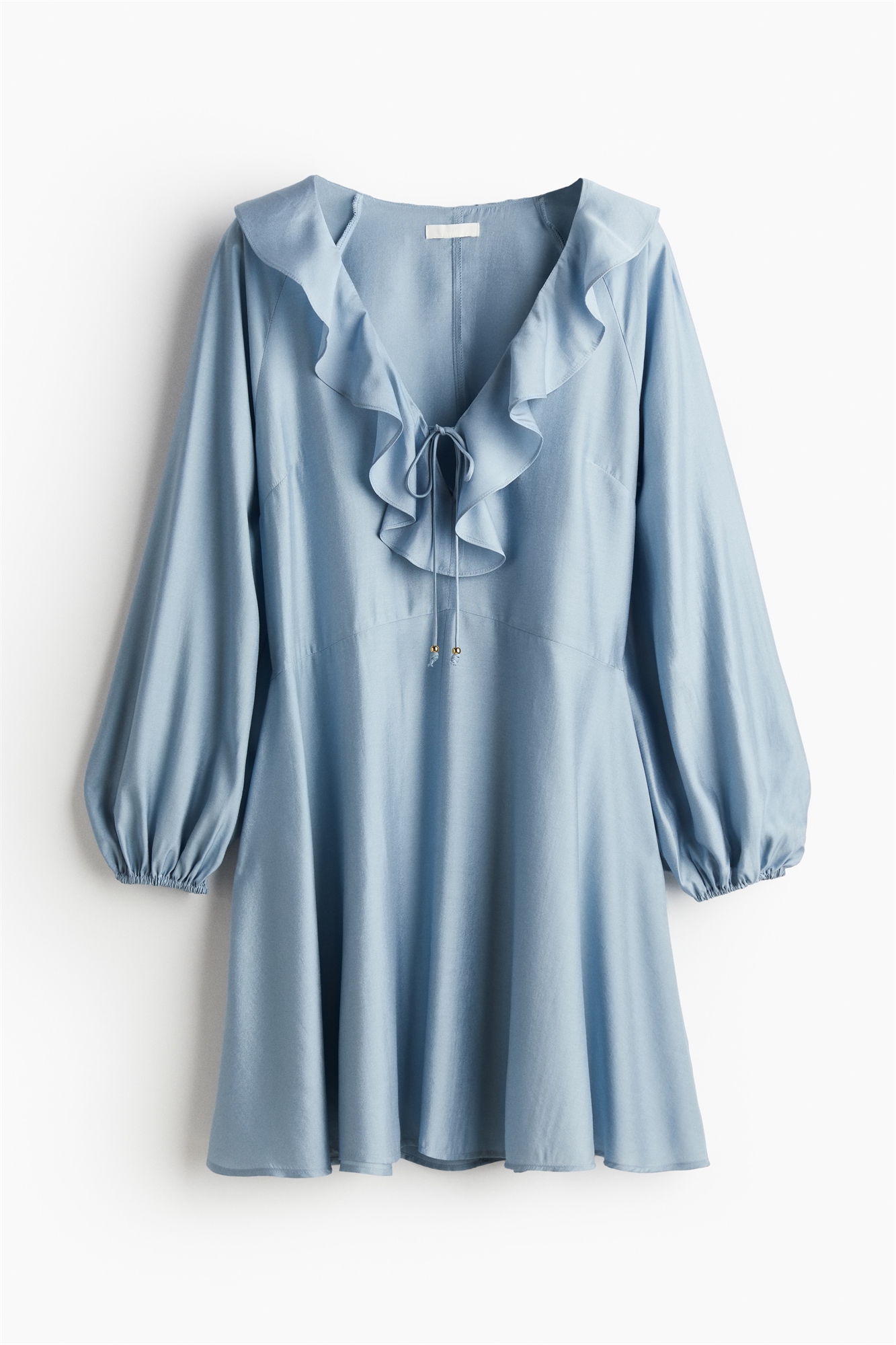 Короткое платье из тканого материала с глубоким V-образным вырезом с отделкой воланами и завязками-спагетти спереди. Длинные рукава реглан с эластичными манжетами и расклешенная юбка. Без подкладки.