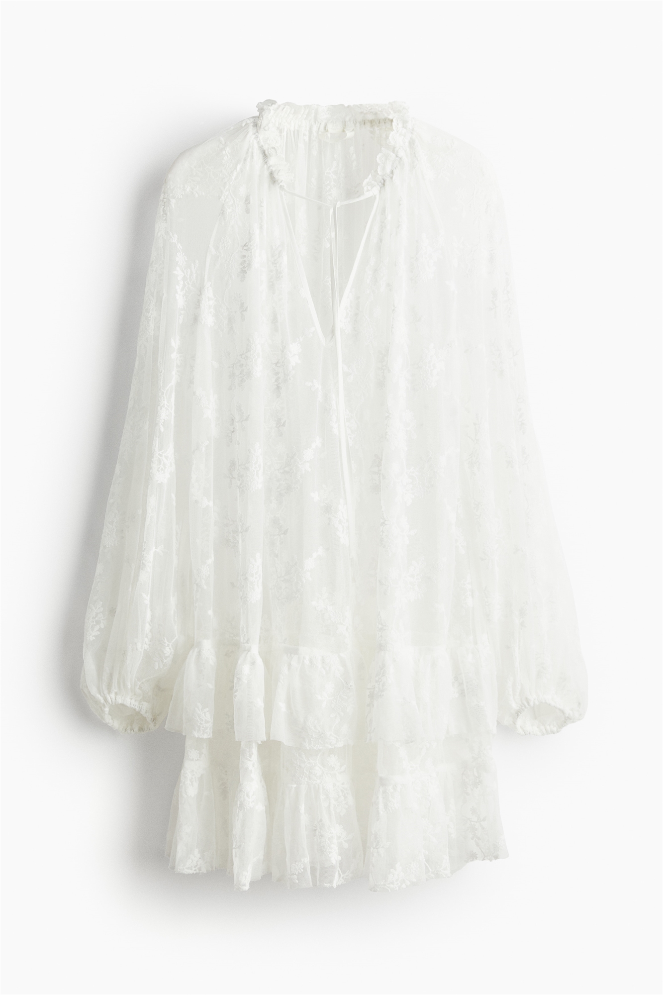 Короткое платье свободного кроя из кружева с круглым вырезом с небольшой оборкой и V-образной проймой с узкими завязками спереди. Длинные рукава реглан с эластичными манжетами. Ярусы по подолу. Без подкладки.