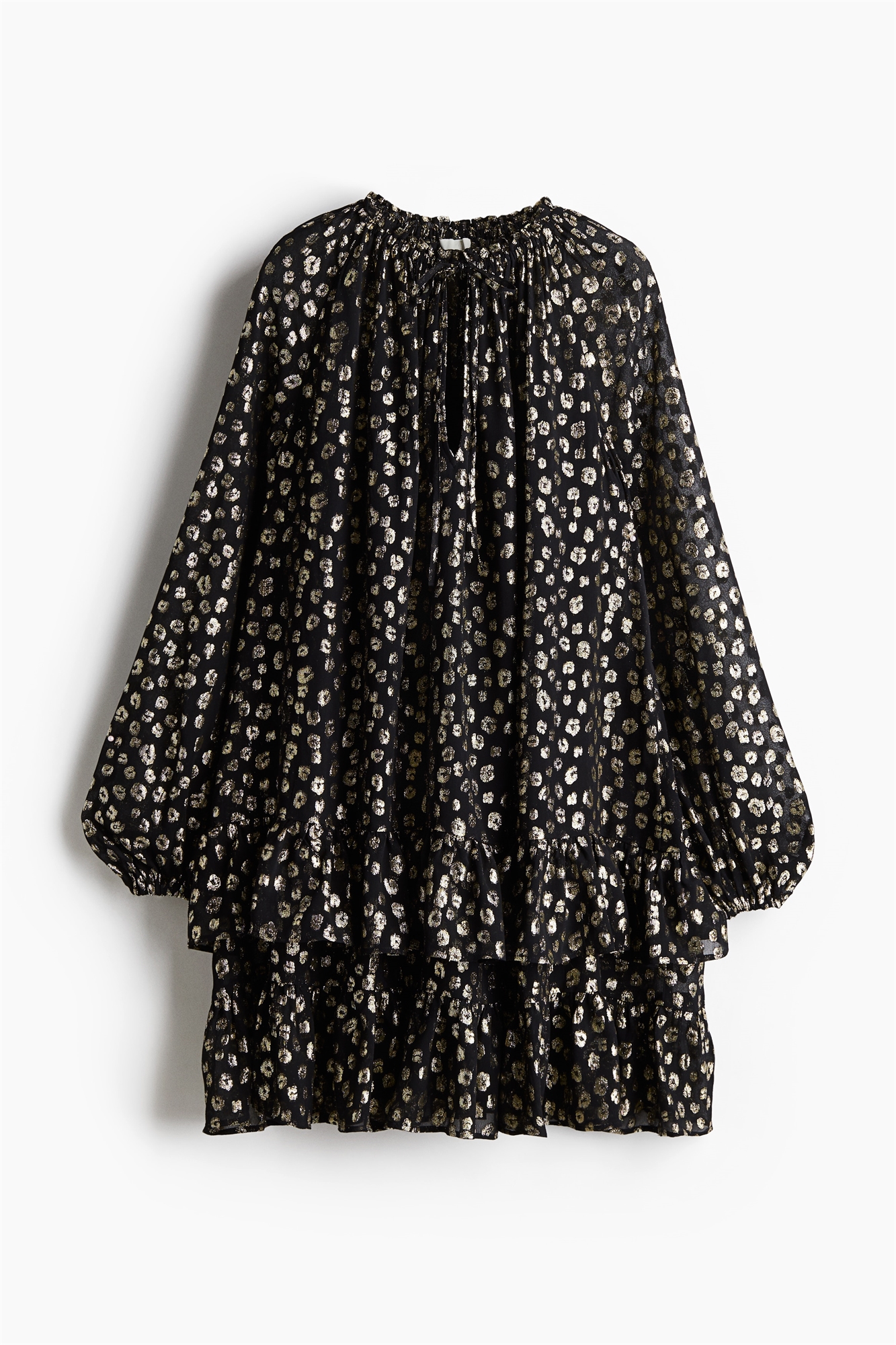 Короткое платье свободного кроя из кружева с круглым вырезом с небольшой оборкой и V-образной проймой с узкими завязками спереди. Длинные рукава реглан с эластичными манжетами. Ярусы по подолу. Без подкладки.