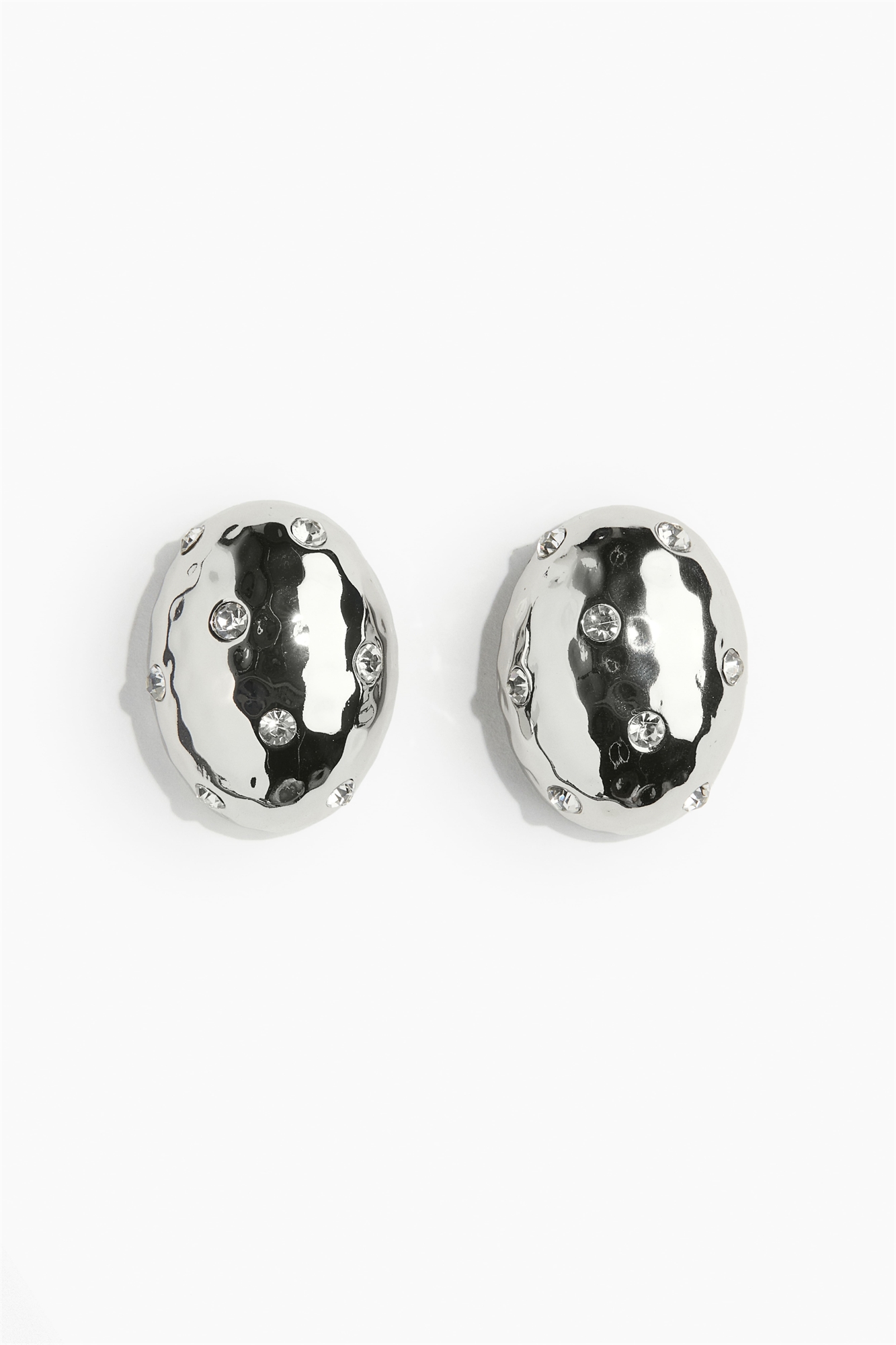 Крупные серьги-шпильки из кованого металла, украшенные сверкающими стеклянными стразами. Длина 4 см.