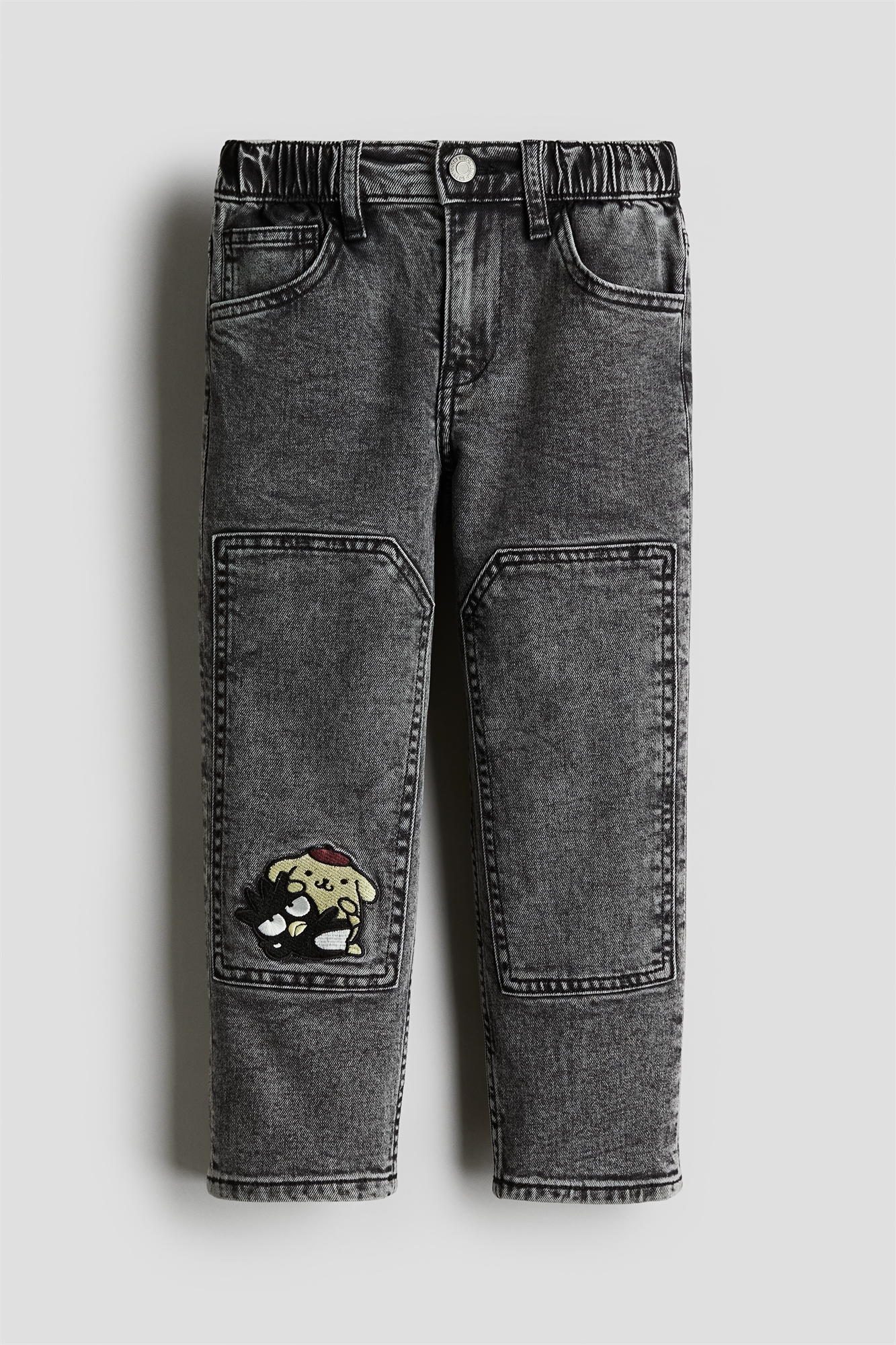 H&M x Hello Kitty and Friends. Веселая и яркая коллекция с уютными фасонами, милыми принтами и игривыми аксессуарами. Откройте для себя мир Hello Kitty и всех наших пушистых любимцев! Джинсы с 5 карманами из моющегося хлопкового денима с заплатками на коленях и вышитой аппликацией на одной штанине. Свободный крой по бедрам, ляжкам и штанинам. Регулируемый эластичный пояс и ширинка на молнии с пуговицей.