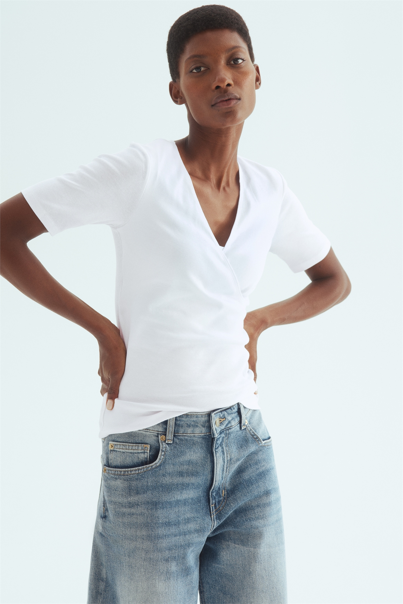 Облегающие топы для кормления из мягкого хлопкового джерси с V-образным вырезом и короткими рукавами. Перекрывающийся разрез спереди и практичный внутренний топ для облегчения доступа к груди.