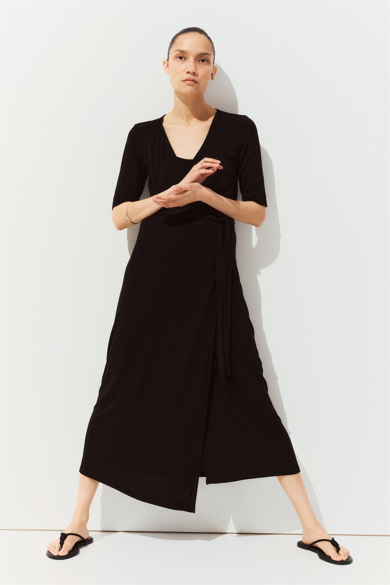 Платье для кормящих длиной до колен из мягкого вискозного трикотажа с V-образным вырезом, рукавами длиной до локтя и завязками спереди под бюстом. Практичный внутренний топ для облегчения доступа к груди.