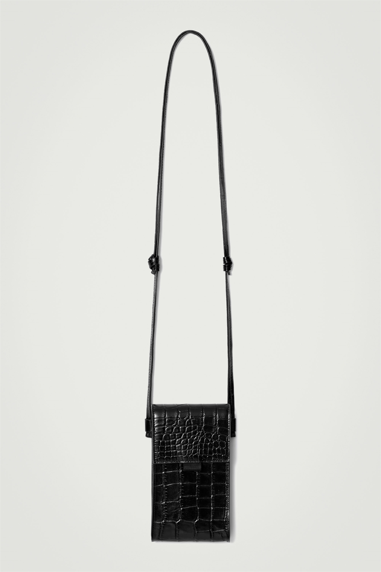 Этот современный чехол для телефона изготовлен из кожи с эффектом крокодила, который придаст изысканную текстуру вашему наряду. Она выполнена в универсальном черном цвете и снабжена магнитным клапаном для защиты ценных вещей. Ремешки с завязками регулируются, поэтому вы можете носить ее как на шее, так и на груди. Магнитная застежка COS поддерживает ответственное производство через Leather Working Group. Подкладка: 100% переработанный хлопок. Без учета отделки Высота: 20 см, Ширина: 11 см, Глубина: 3 см