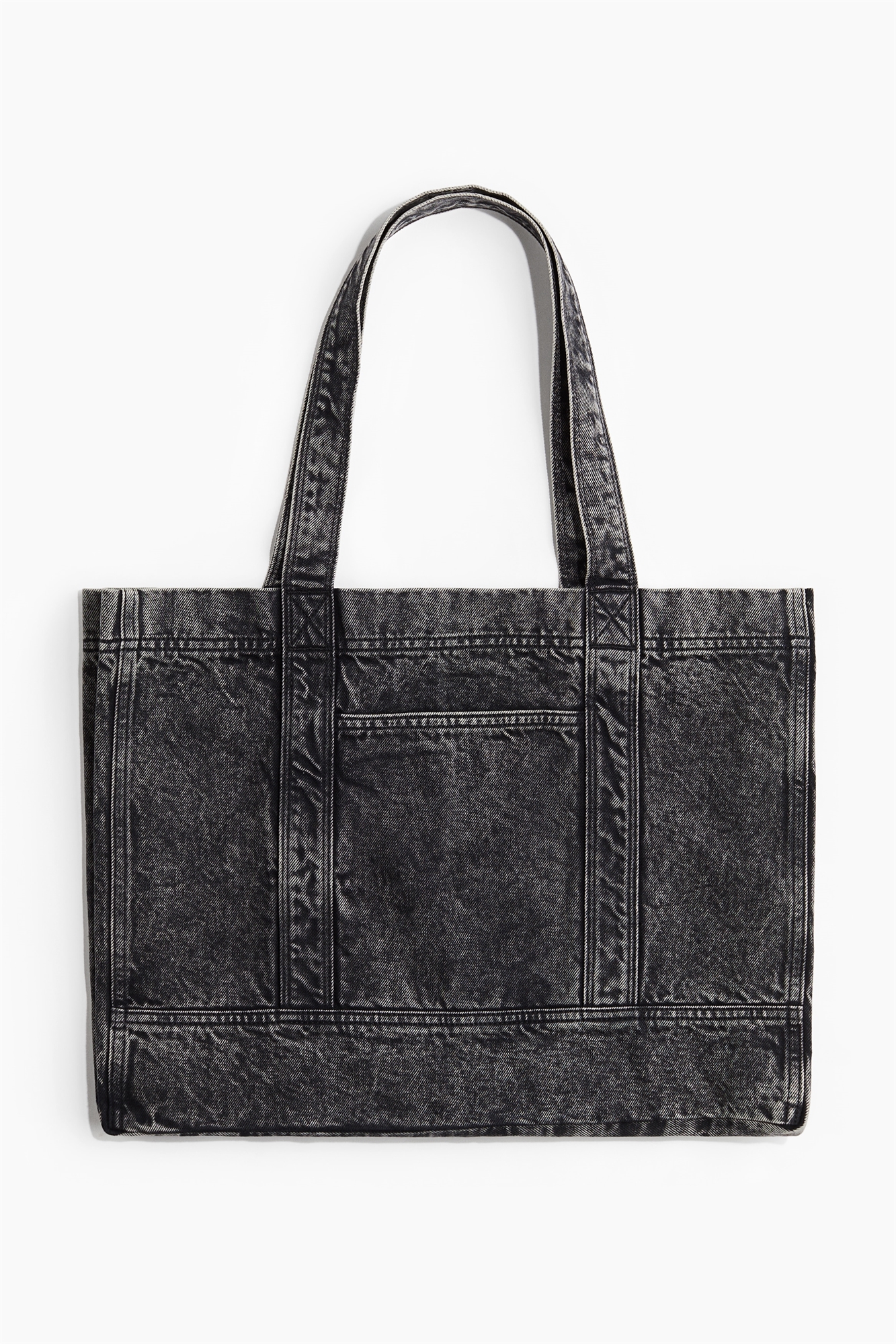 Сумка-шоппер из прочного хлопкового денима в стираном стиле. С двумя ручками для переноски и открытым внешним отделением спереди. Без подкладки. Глубина 12 см. Высота 42 см. Ширина 46 см.