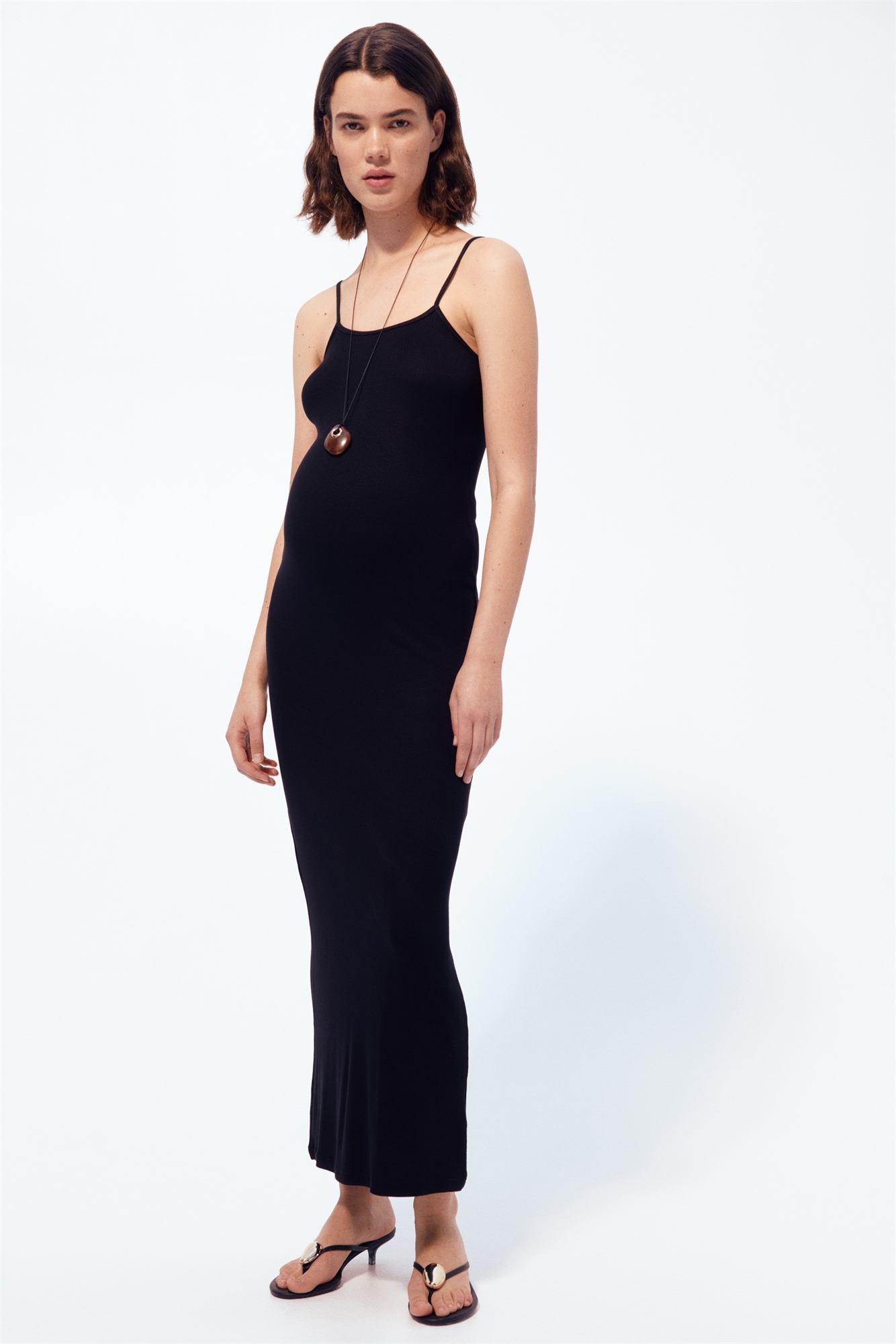 Приталенное платье длиной до щиколоток из трикотажной вискозы с узкими регулируемыми бретелями.