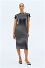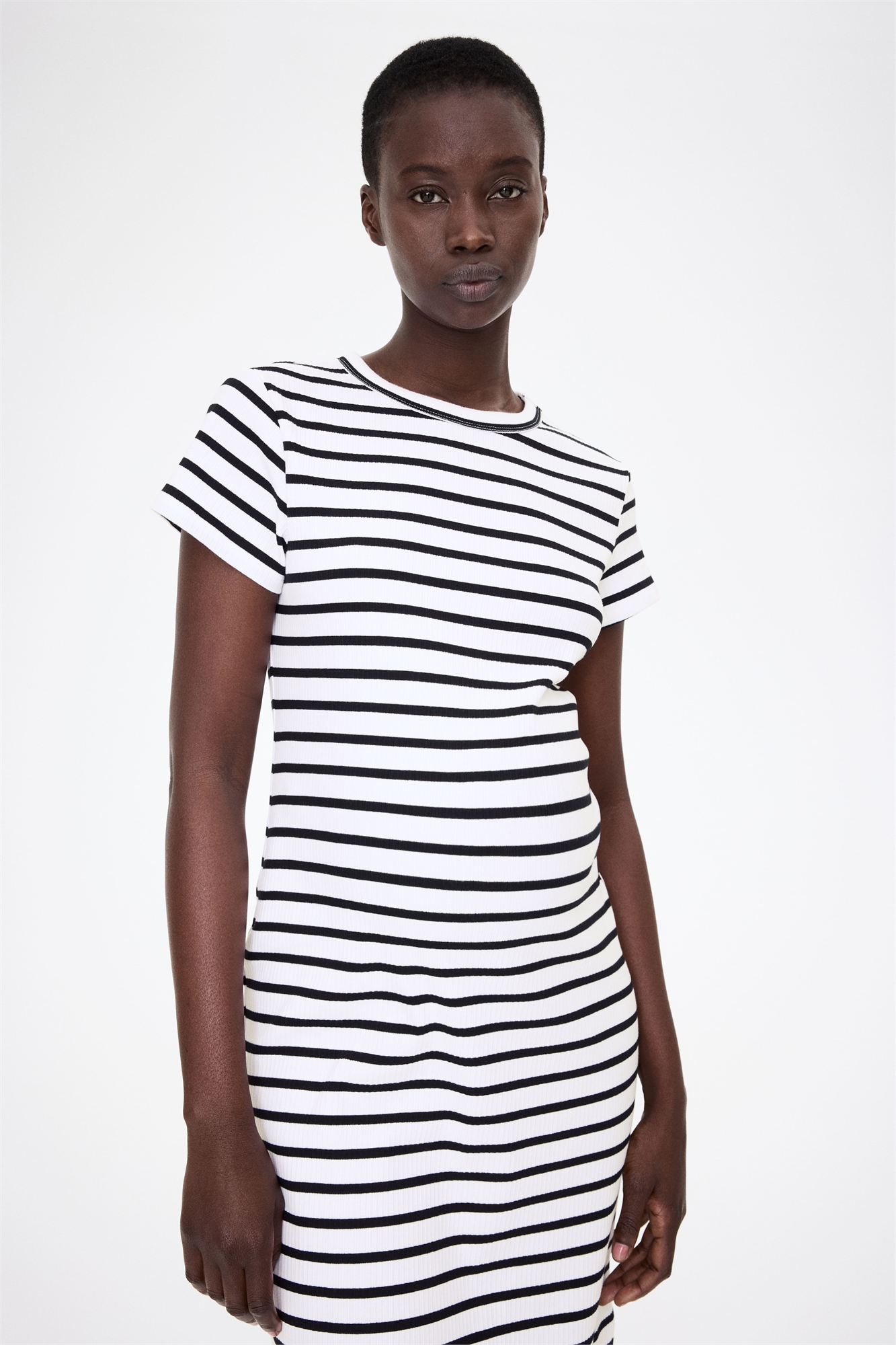 Приталенное платье длиной до колен из ребристого хлопкового джерси с горловиной и короткими рукавами. Подол прямого кроя с разрезом с одной стороны.