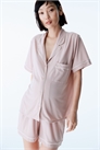Пижама с рубашкой и шортами из мягкого трикотажа с отделкой акцентного цвета. Рубашка с короткими рукавами, округлым курортным воротником, пуговицами спереди и накладным нагрудным карманом. Шорты с эластичной резинкой на талии для комфортной посадки во время и после беременности.
