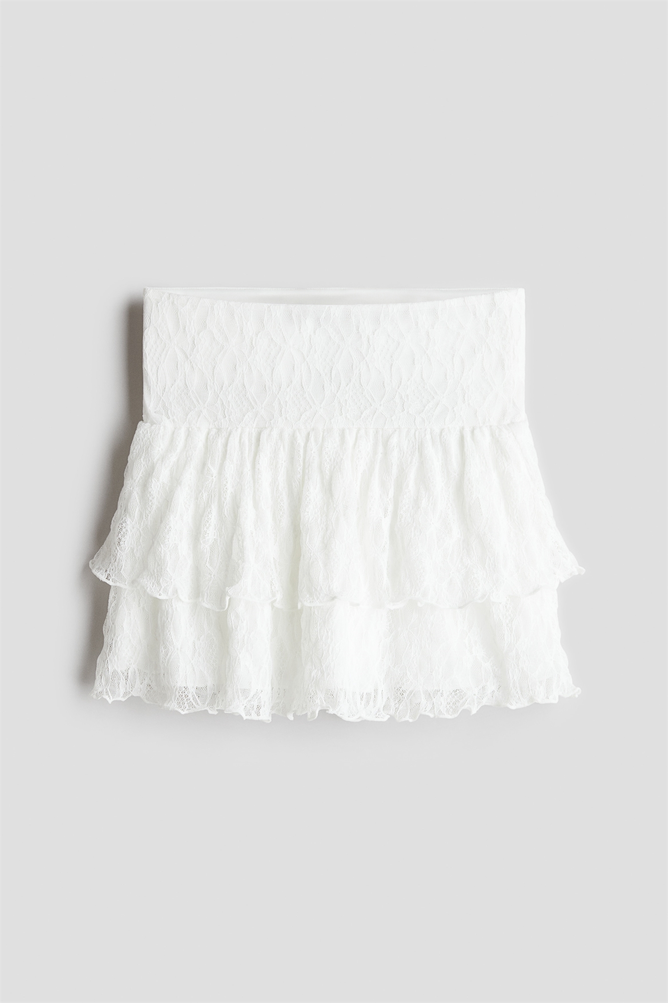 Юбка из джерси с широким поясом и ярусами из кружева с оверлочными краями.