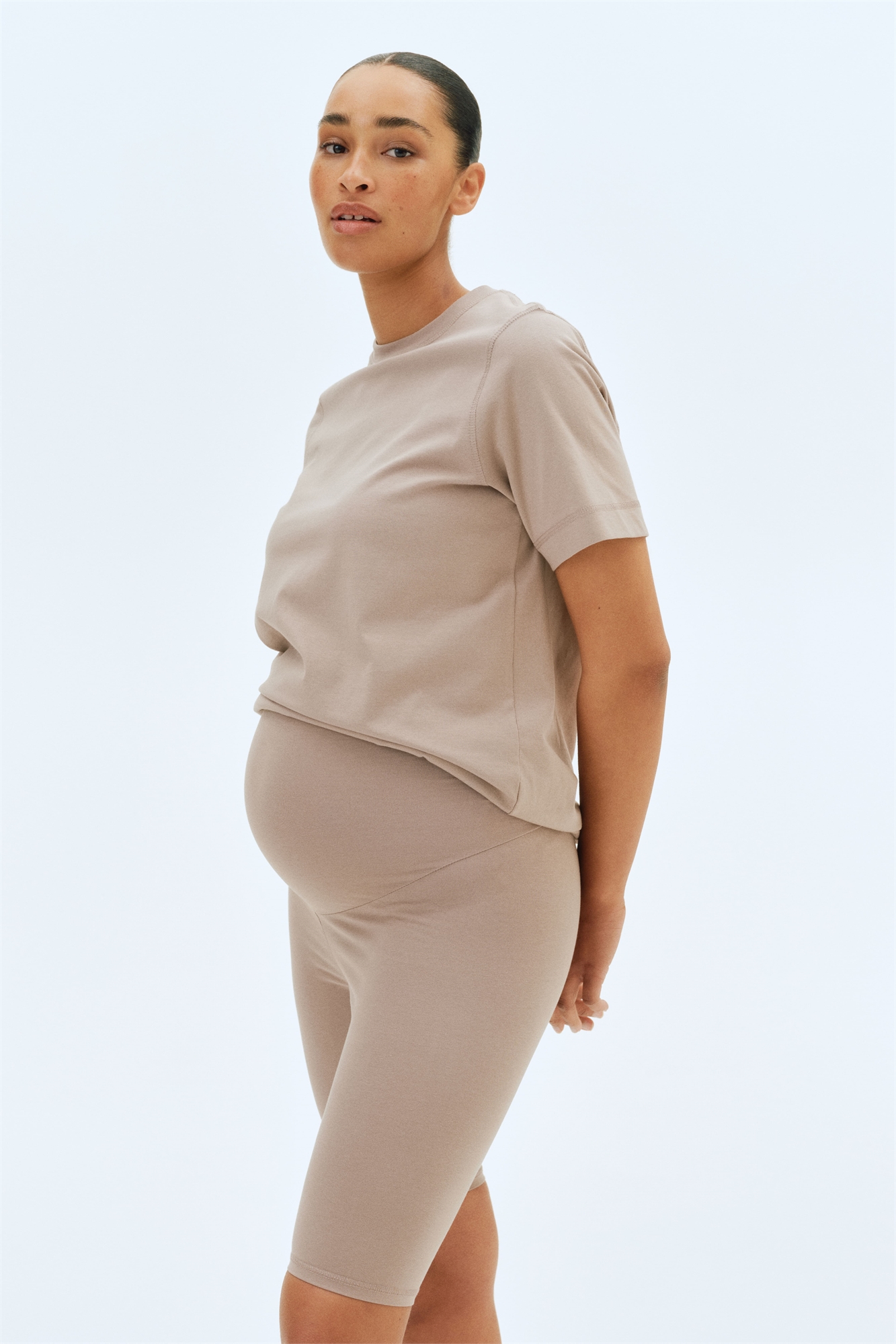 Удобный комплект из футболки и пары велосипедных шорт из мягкого хлопкового джерси. Шорты длиной до колена с широкой панелью из джерси на талии для лучшей посадки на животике.