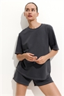 Комплект из футболки и шорт из легкого толстовочного материала. Футболка с горловиной и прямым покроем с разрезом по бокам. Шорты с заниженной эластичной талией и небольшим разрезом на подоле. Комплект можно носить как во время, так и после беременности.