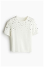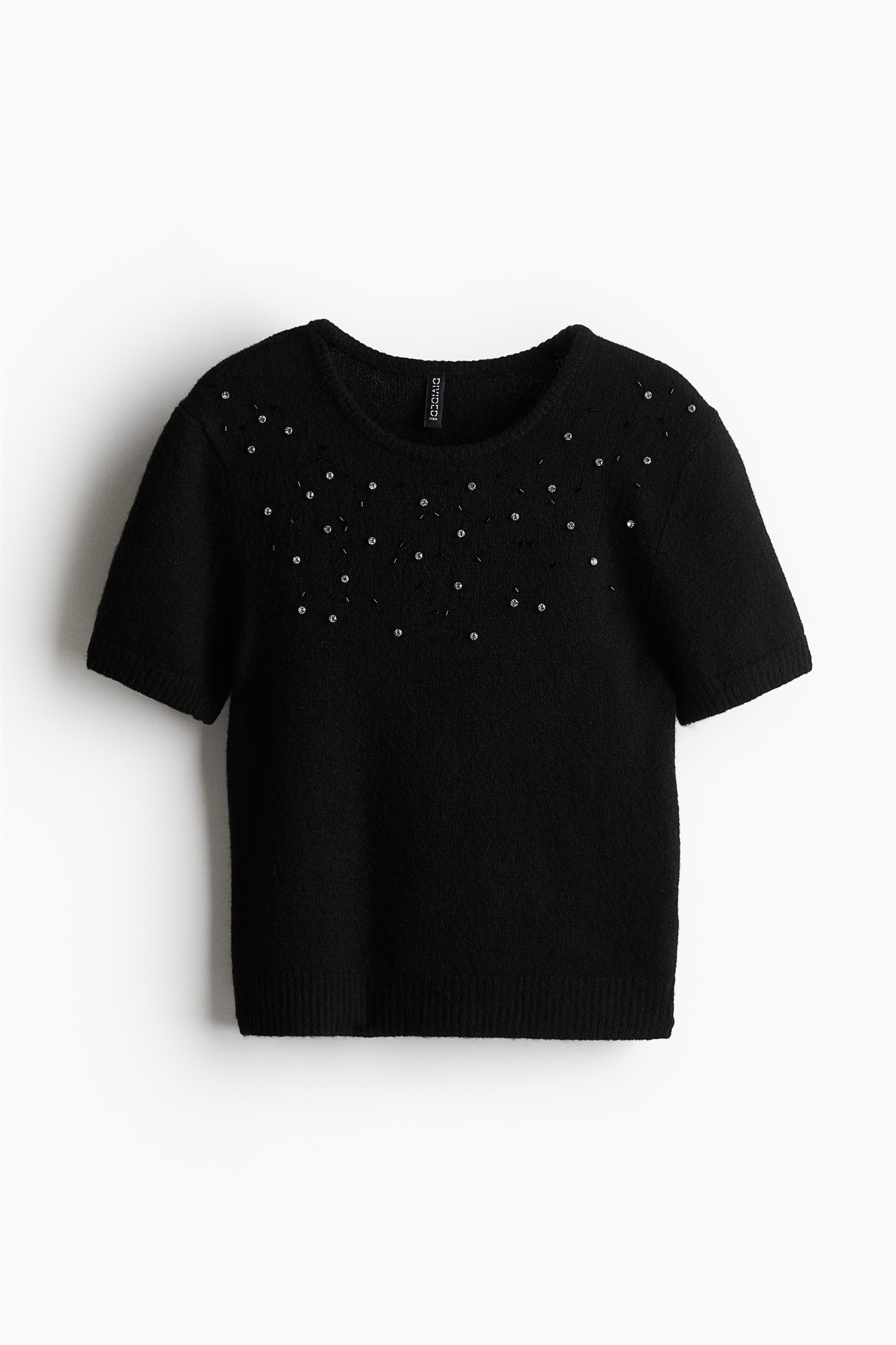 Короткий приталенный топ из мягкого тонкого трикотажа с украшениями в верхней части спереди. Круглый вырез в рубчик, короткие рукава, манжеты и подол в рубчик.