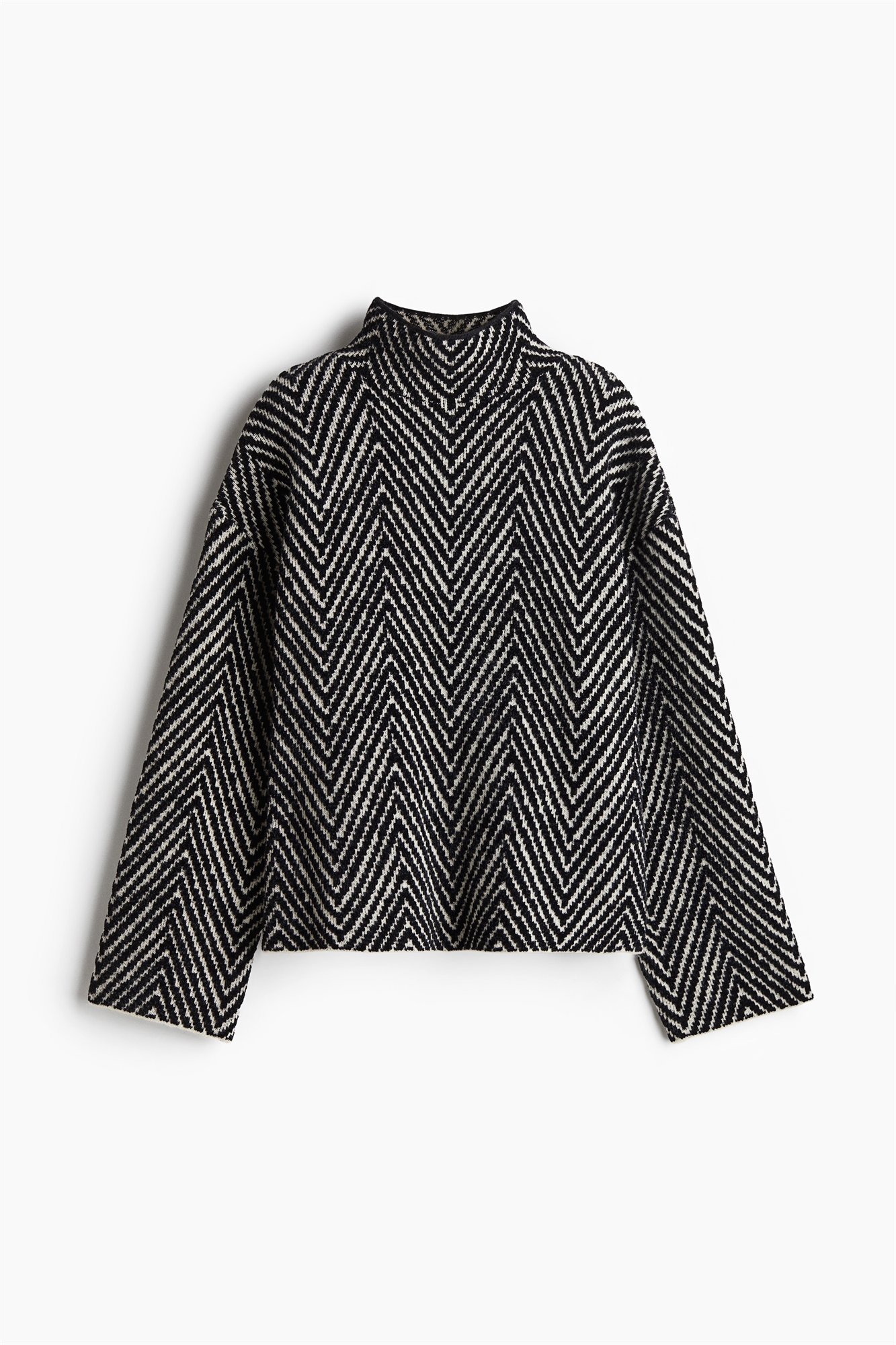 Джемпер свободного кроя из узорчатого жаккардового трикотажа из шерстяной смеси с черепаховой горловиной, спущенными плечами и длинными рукавами.