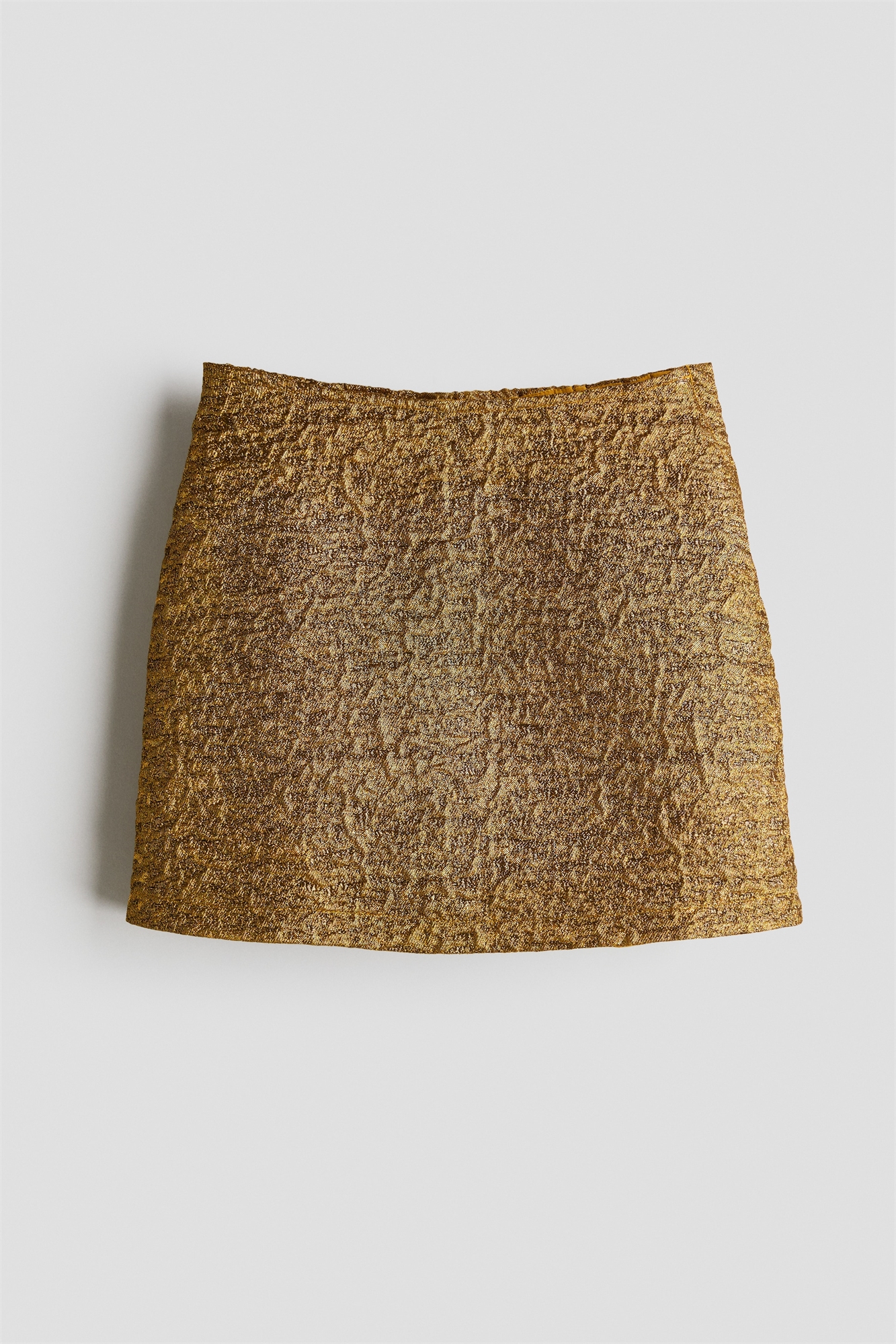 Юбка из мерцающего жаккардового переплетения с регулируемой эластичной талией и потайной застежкой на молнию и пуговицу с одной стороны. На подкладке.