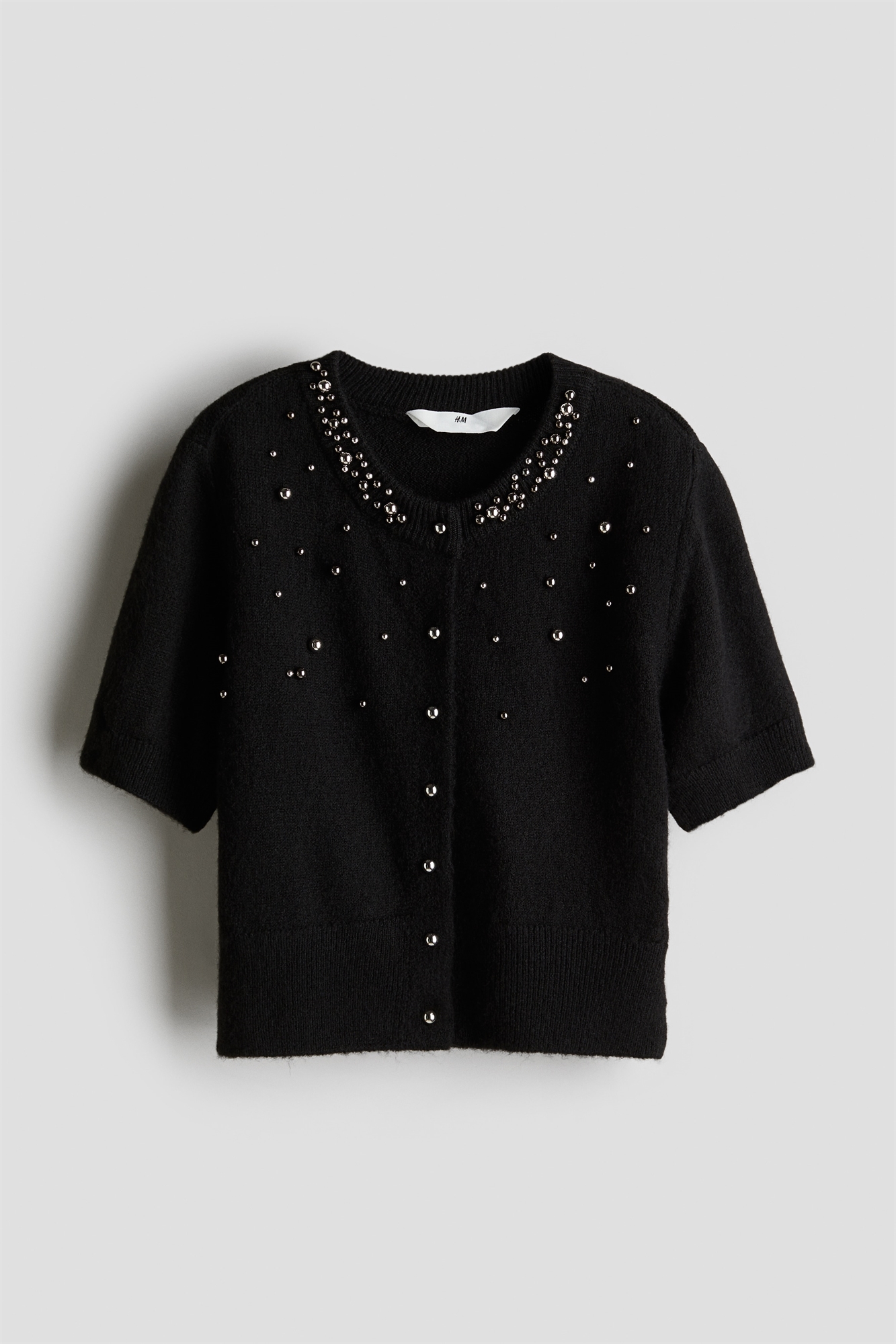 Короткий кардиган из мягкого тонкого трикотажа украшен бусинами спереди. Круглый вырез с ребристой отделкой, застежка на шарообразные пуговицы спереди и короткие рукава. Ребристые манжеты и подол.