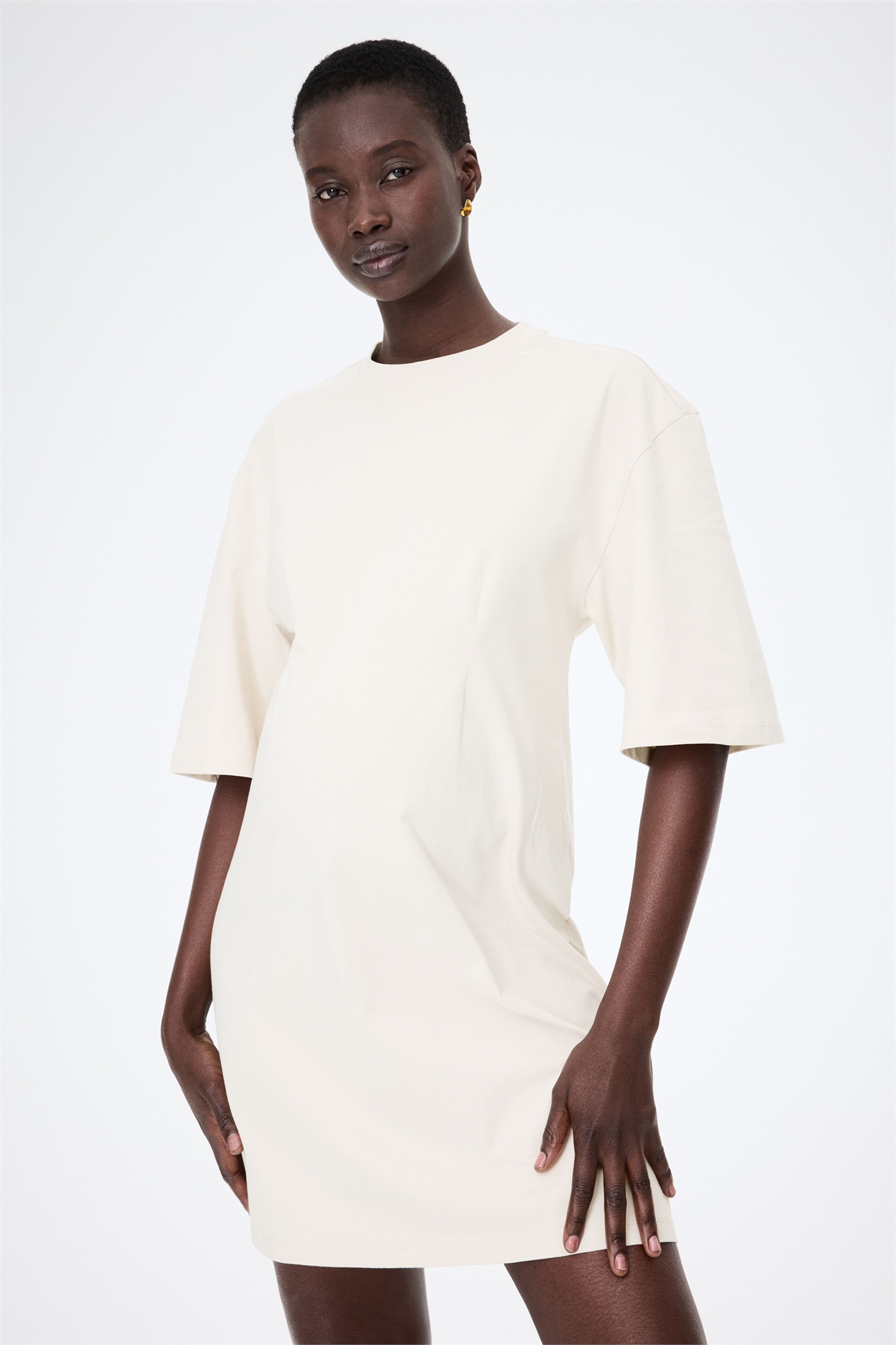 Короткое платье из мягкого хлопкового джерси с горловиной, спущенными плечами и рукавами, заканчивающимися чуть выше локтей. Зауженная часть под бюстом с формирующими вытачками спереди и сзади.