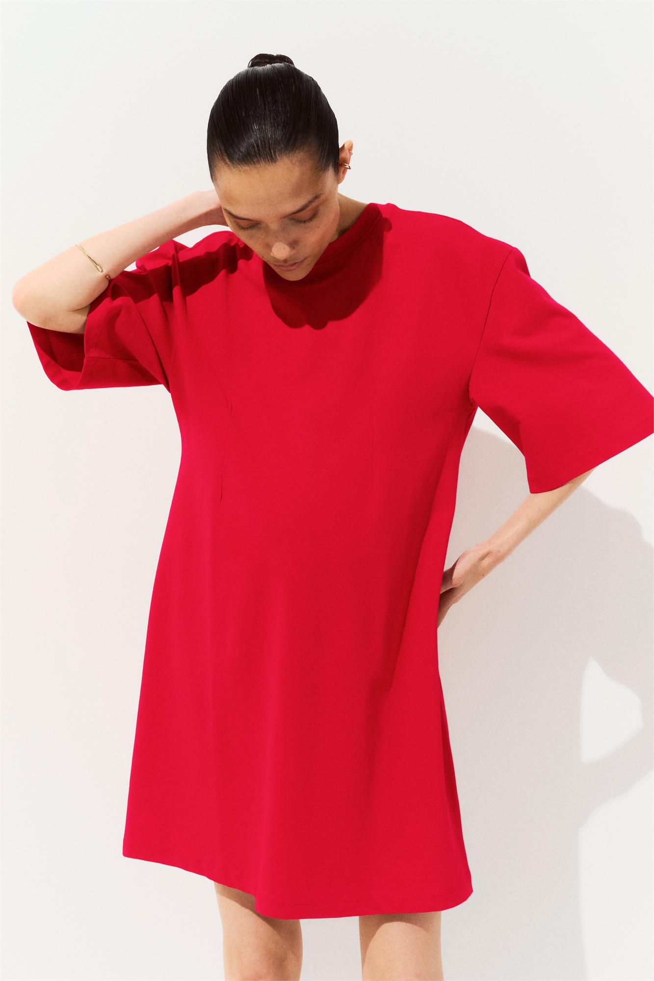 Короткое платье из мягкого хлопкового джерси с горловиной, спущенными плечами и рукавами, заканчивающимися чуть выше локтей. Зауженная часть под бюстом с формирующими вытачками спереди и сзади.