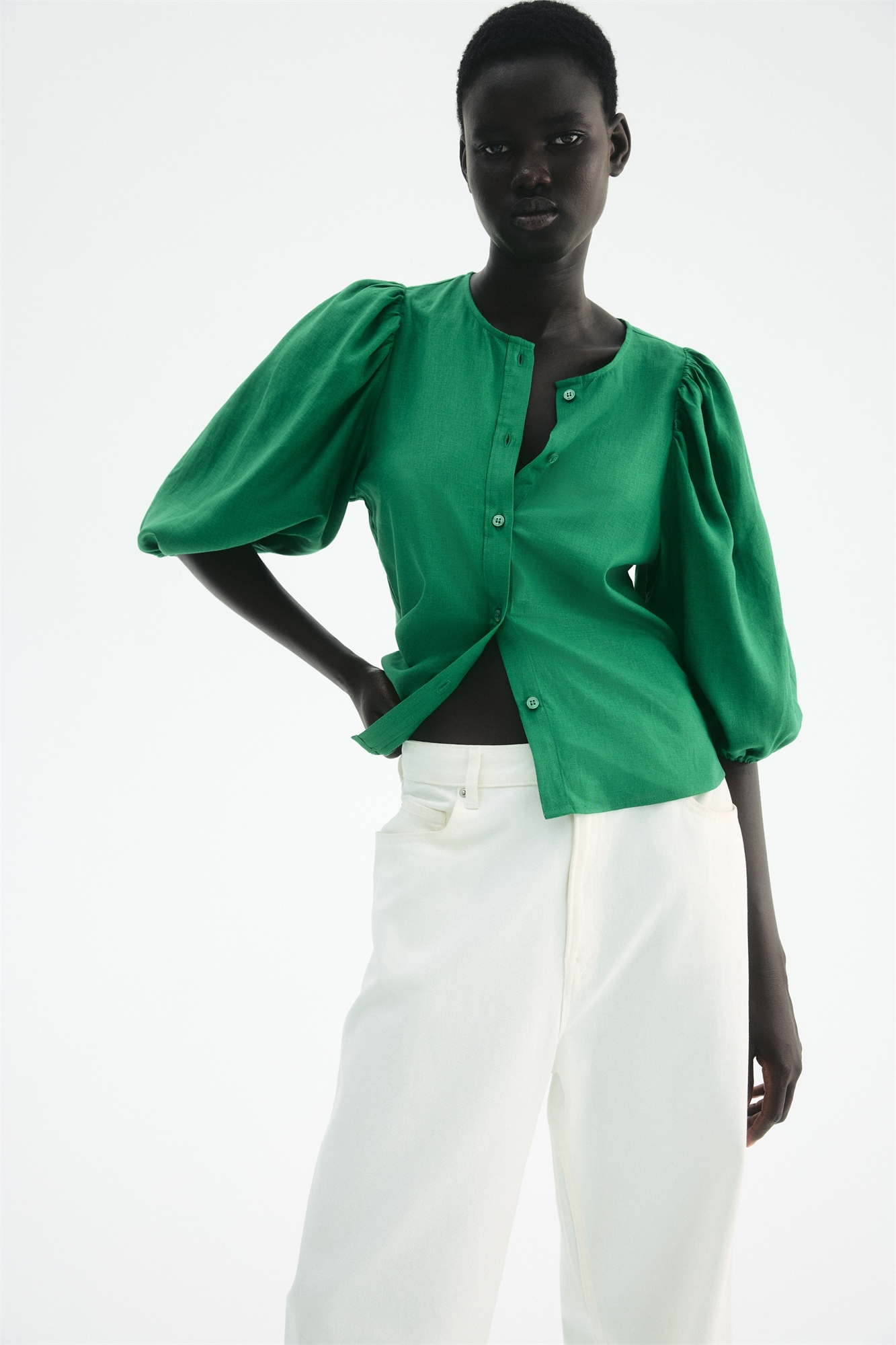 Приталенная блузка воздушного плетения из смеси льна. Круглый вырез, застежка на пуговицы спереди и рукава-баллон длиной 3/4 с эластичными манжетами.