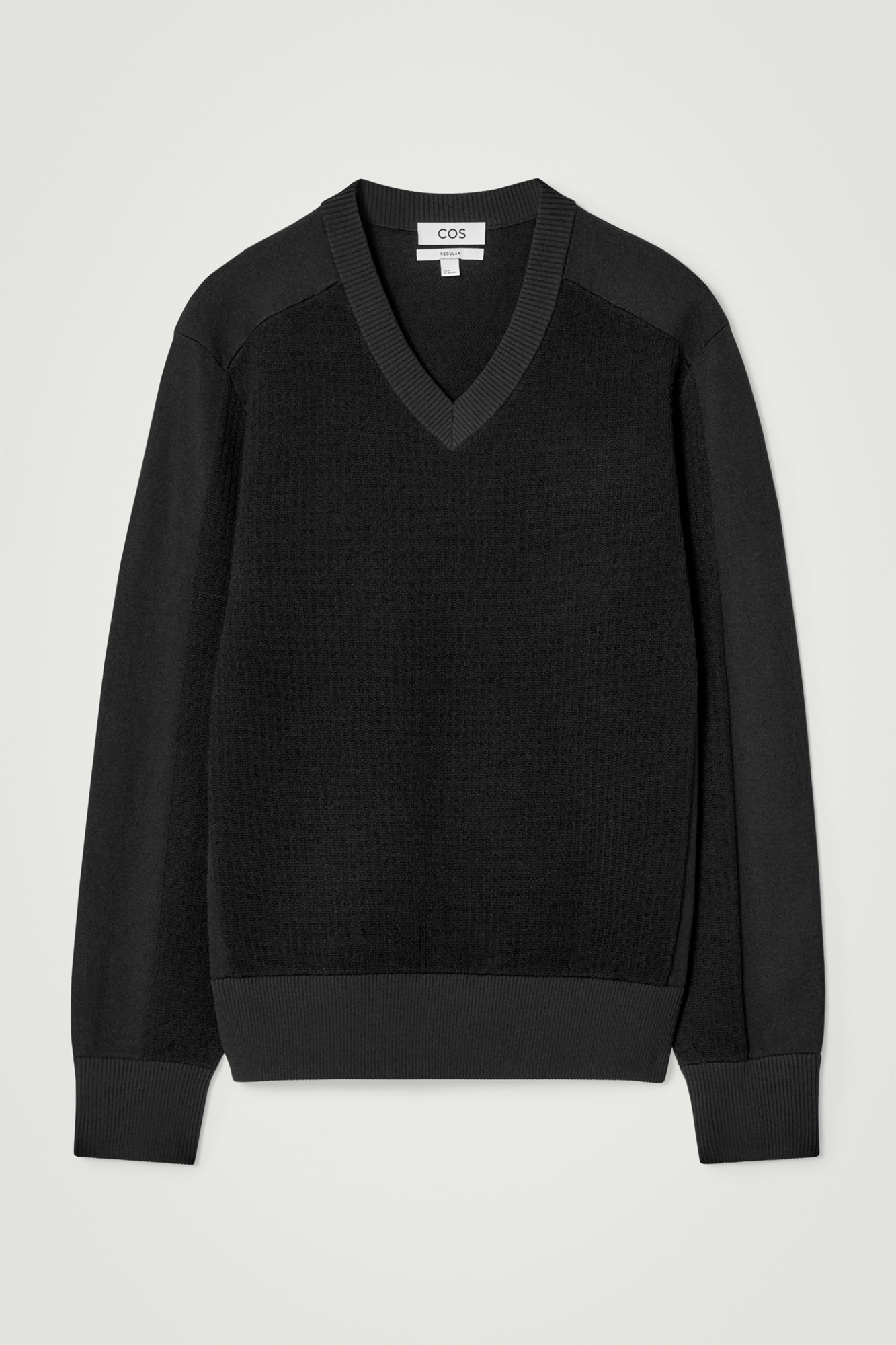 Этот современный джемпер, представленный в универсальном черном цвете, связан из натуральной теплой шерстяной смеси RWS с тонко контрастирующими панелями по бокам и на рукавах. Он имеет классический крой, V-образный вырез и ребристую отделку. Носите его отдельно или поверх рубашки с воротником. Регулярный крой В состав изделия входит шерстяное волокно Responsible Wool Standard TE-00047206 (RWS), произведенное на фермах, сертифицированных в соответствии с требованиями к благополучию животных и землепользованию Панель 1: 89% шерсти RWS, 11% полиамида (нейлона). Панель 2: 100% полиамид. Без учета отделки / Машинная стирка Длина спины размера M составляет 65 см / Модель носит размер M