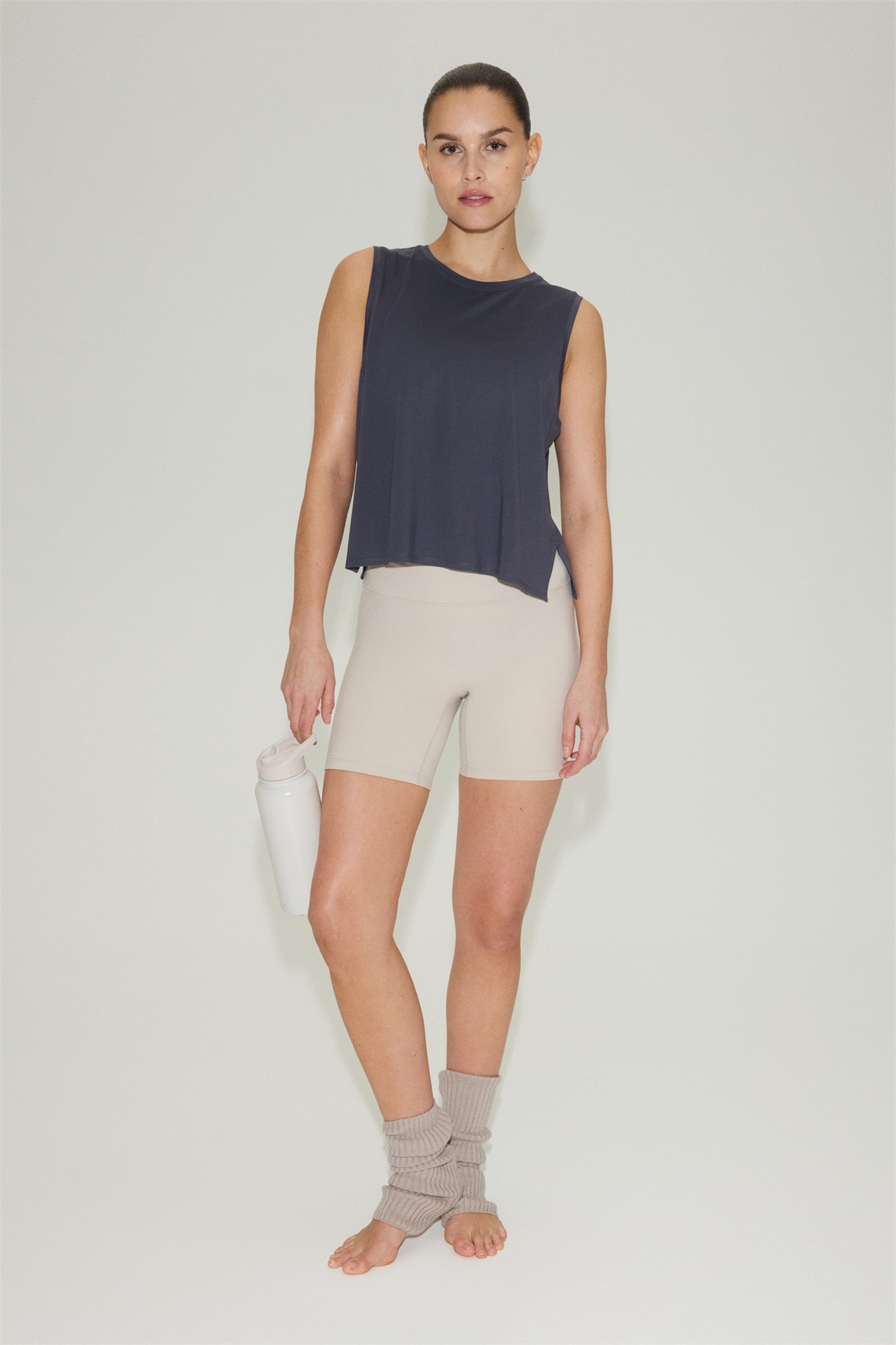 Спортивная майка прямого кроя бокси из функциональной ткани с добавлением DryMove™, которая отводит влагу от кожи, обеспечивая комфортную сухость во время движения. Свободный крой с круглым вырезом и прямой подол с разрезом с каждой стороны.