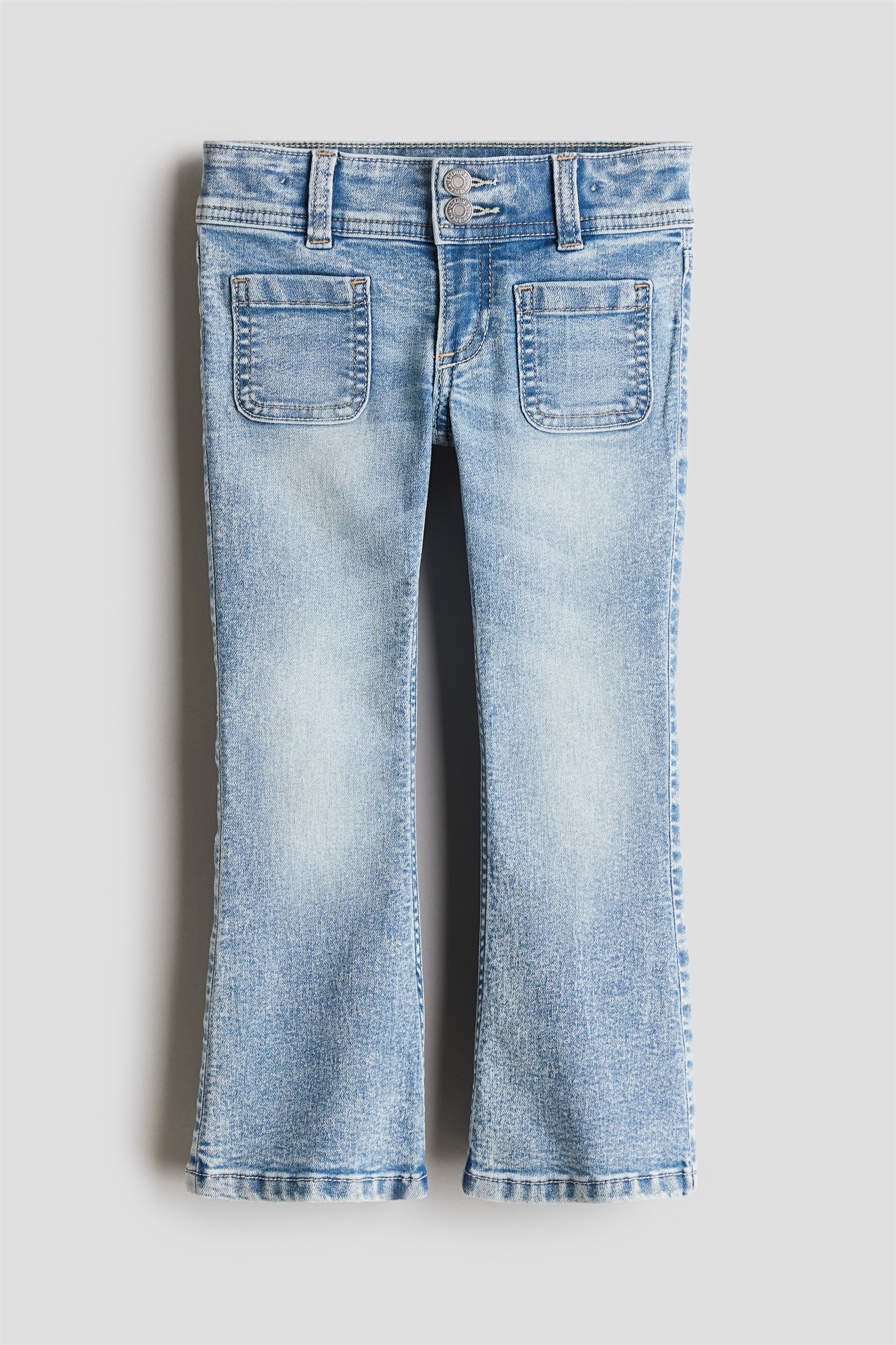 Джинсы из мягкого денима с регулируемой эластичной талией, ширинкой на молнии с двумя застежками, накладными передними карманами, открытыми задними карманами и расклешенными краями.
