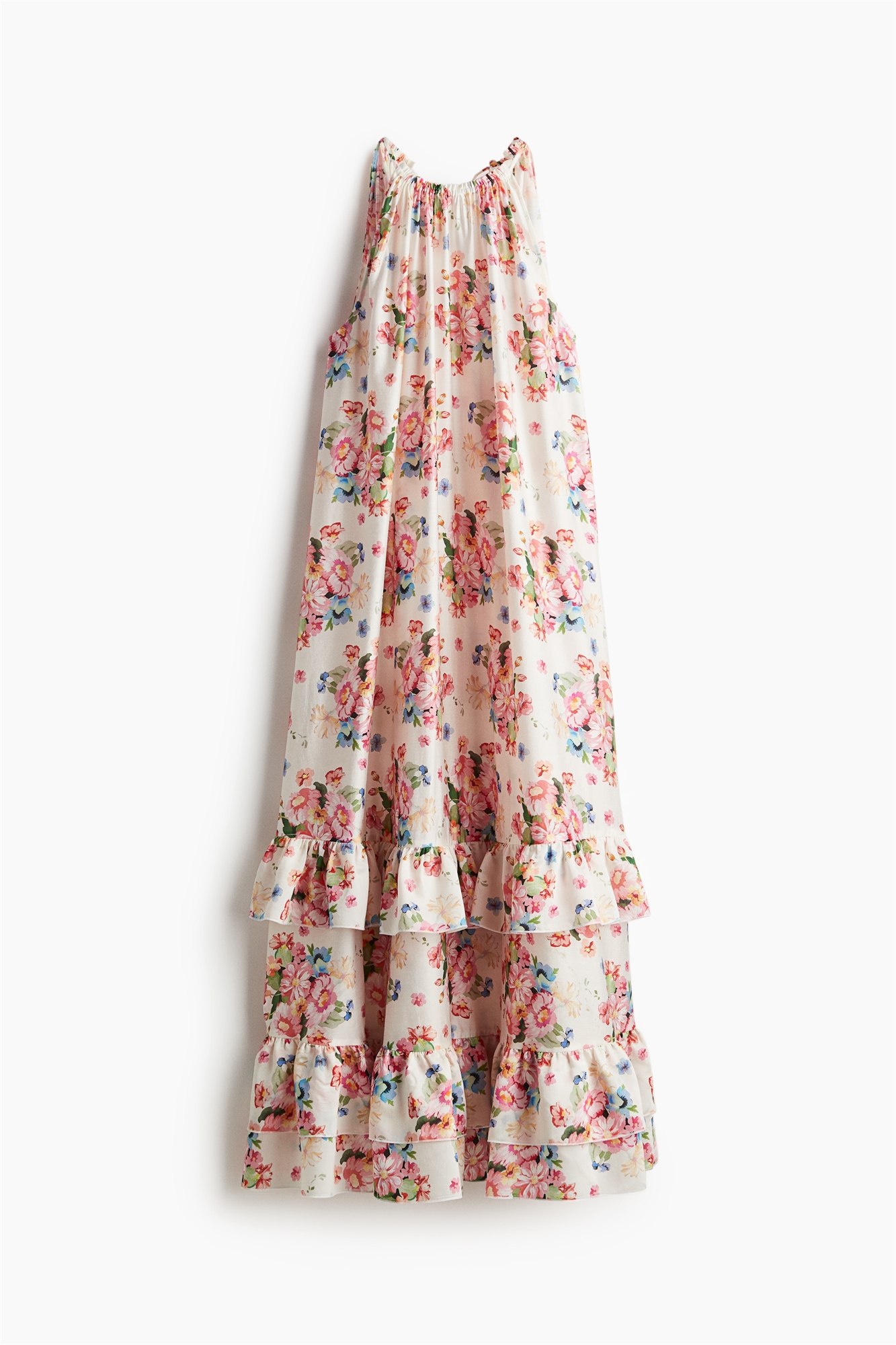 Длинное платье без рукавов из тканого материала с узким вырезом в верхней части и круглым вырезом с завязками на шее. Свободный крой с А-линией силуэта и воланами по подолу. Без подкладки.