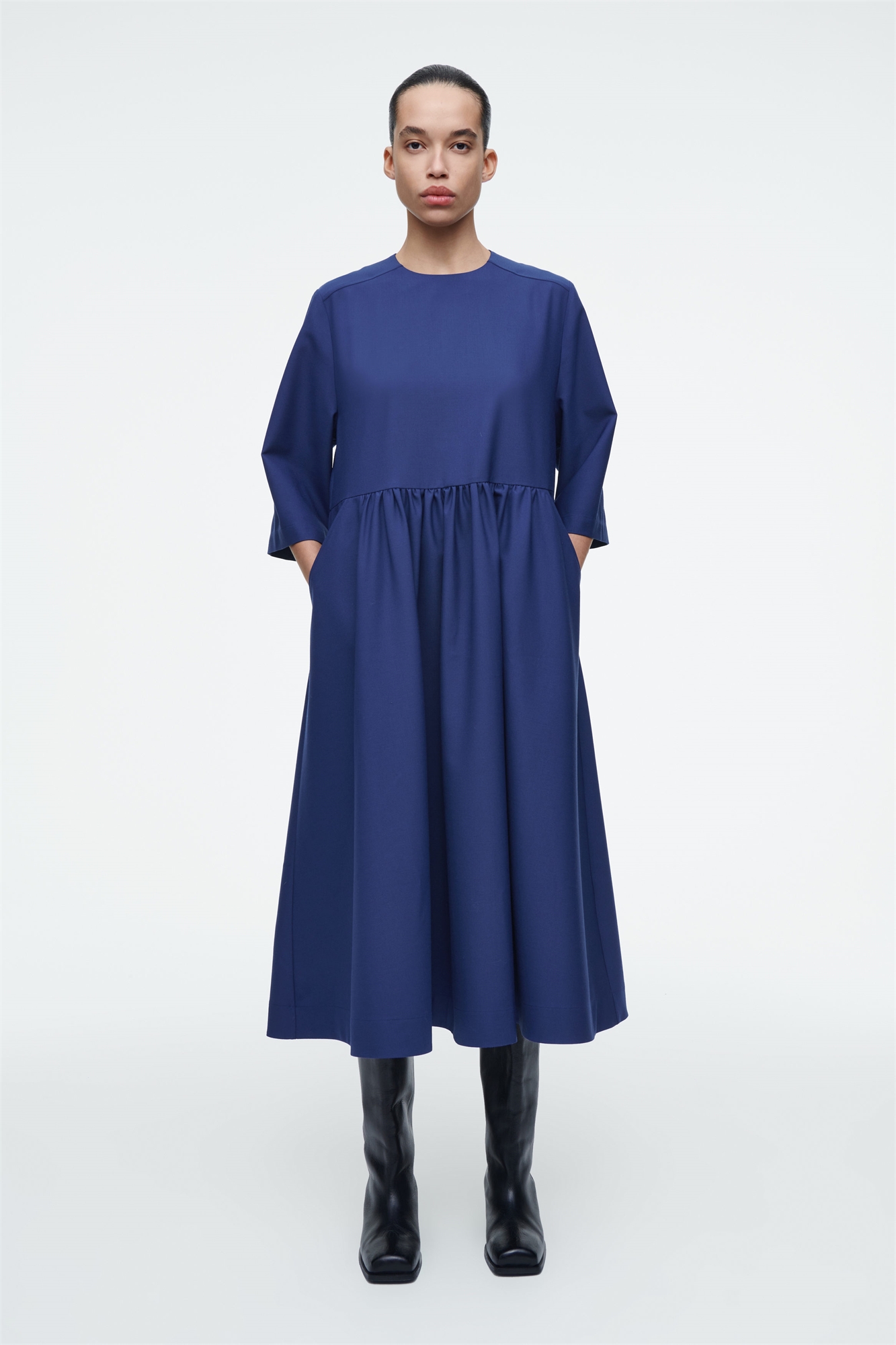 Это современное платье-миди подойдет как для нарядного, так и для повседневного гардероба. Оно сшито из шерстяной саржи RWS и мягко собрано на талии, придавая непринужденную объемную форму. Дополните его сапогами до колена. Свободный крой Застежка на пуговицах Лучшая альтернатива обычному полиэстеру, переработанный полиэстер изготавливается из отходов до и после потребления Оболочка: 54% переработанного полиэстера, 44% шерсти RWS, 2% эластана. Подкладка: 100% хлопок. Без учета отделки / Машинная стирка Длина по спинке для размера EU 36 составляет 121 см / Модель носит размер EU 36
