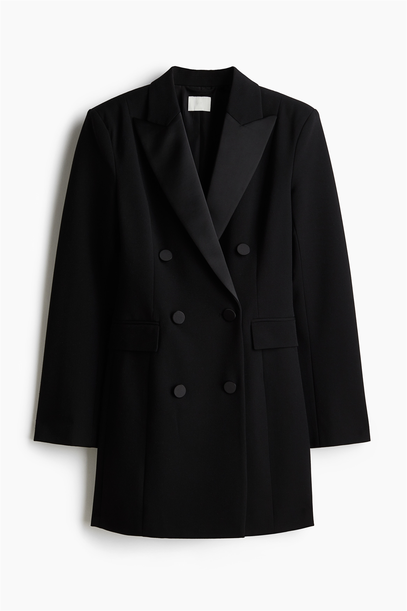 Короткое приталенное платье-смокинг из тканого материала с атласными отворотами и двубортной передней частью с закрытыми пуговицами. Накладки на плечах, втачные карманы с клапаном, швы "принцесса" спереди и сзади для придания силуэту четкости. На подкладке.