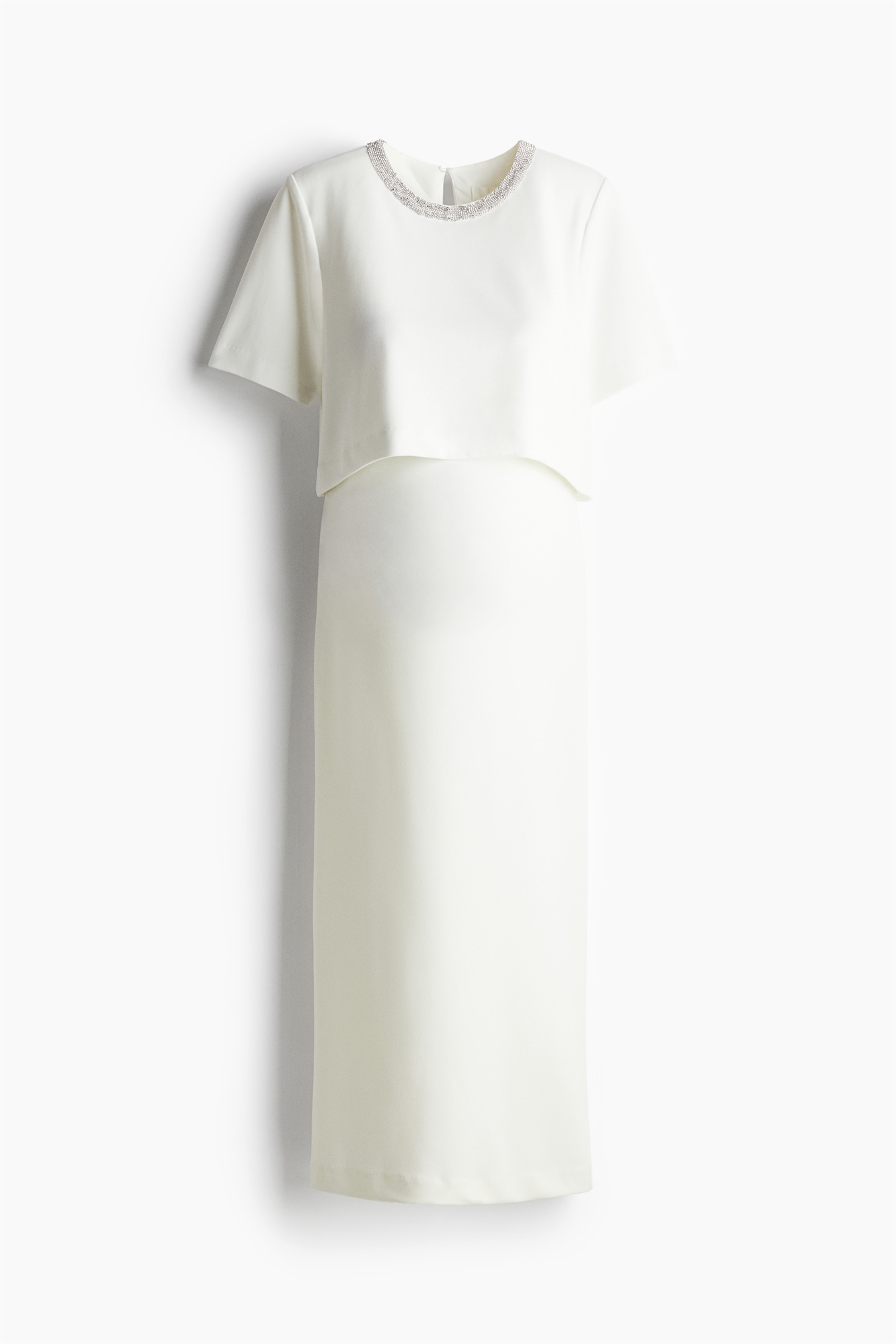 Комплект из короткого топа и юбки длиной до щиколоток из джерси-крепа. Топ с короткими рукавами, круглым вырезом, украшенным стразами, и прорезью для ключа с потайной пуговицей сзади. Плечевые накладки для придания силуэту четкости. Лиф на подкладке. Юбка со скрытой резинкой в верхней части для лучшей посадки на животе и подол прямого кроя с разрезом сзади. На подкладке.