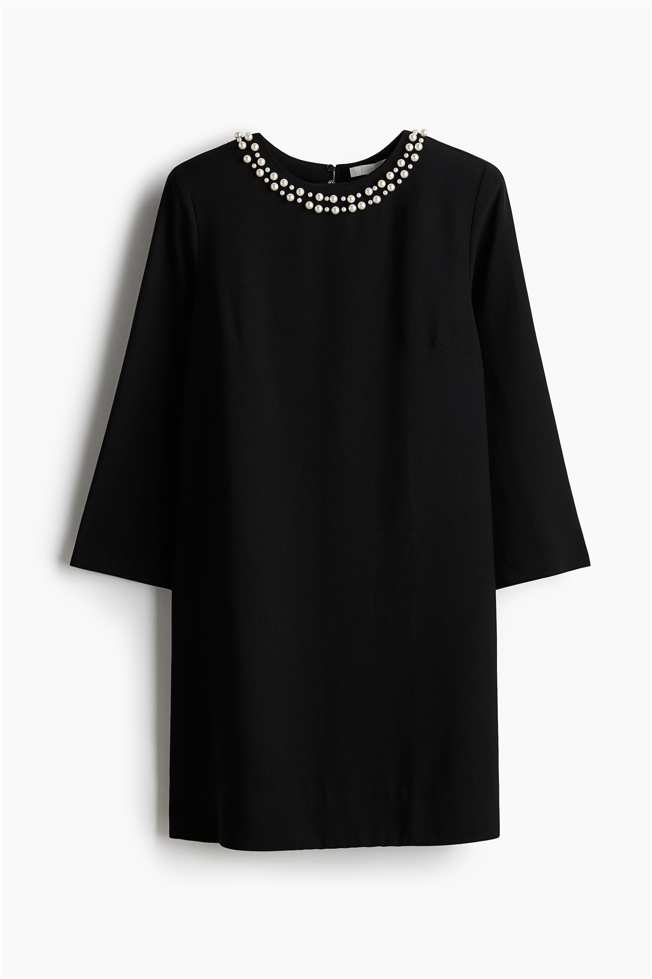 Короткое платье из тканого материала с украшениями по вырезу горловины и прорезью для ключа с потайными пуговицами сзади. Накладки на плечах, длинные рукава и прямой подол. Без подкладки.
