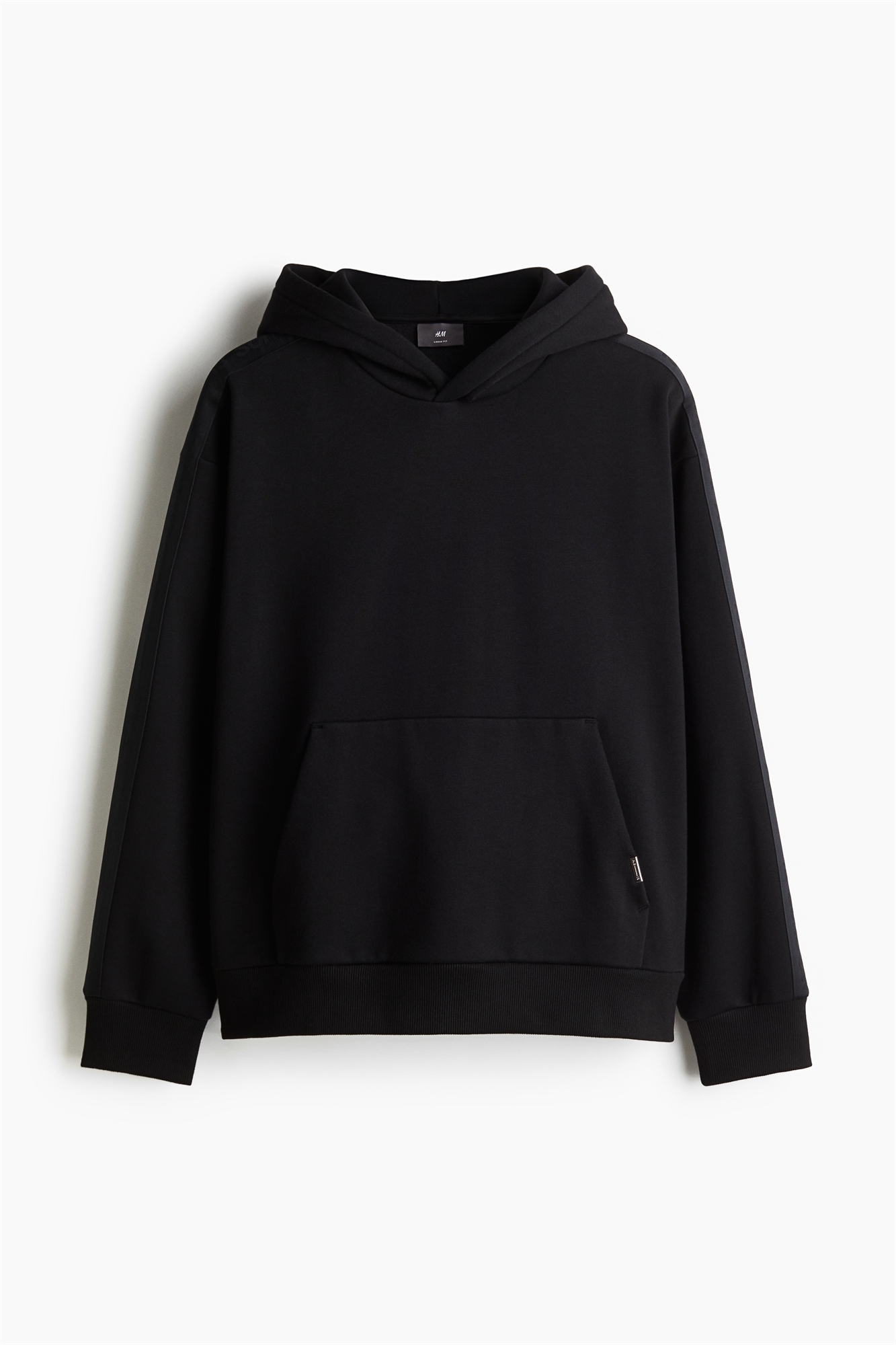 Толстовка из плотного толстовочного материала из смеси хлопка с мягким начесом внутри. Капюшон на подкладке, спущенные плечи и длинные рукава с боковыми полосками из гросгрейн. Карман-кенгуру и окантовка манжет и подола. Свободный крой для пышного, но не чрезмерно большого силуэта.